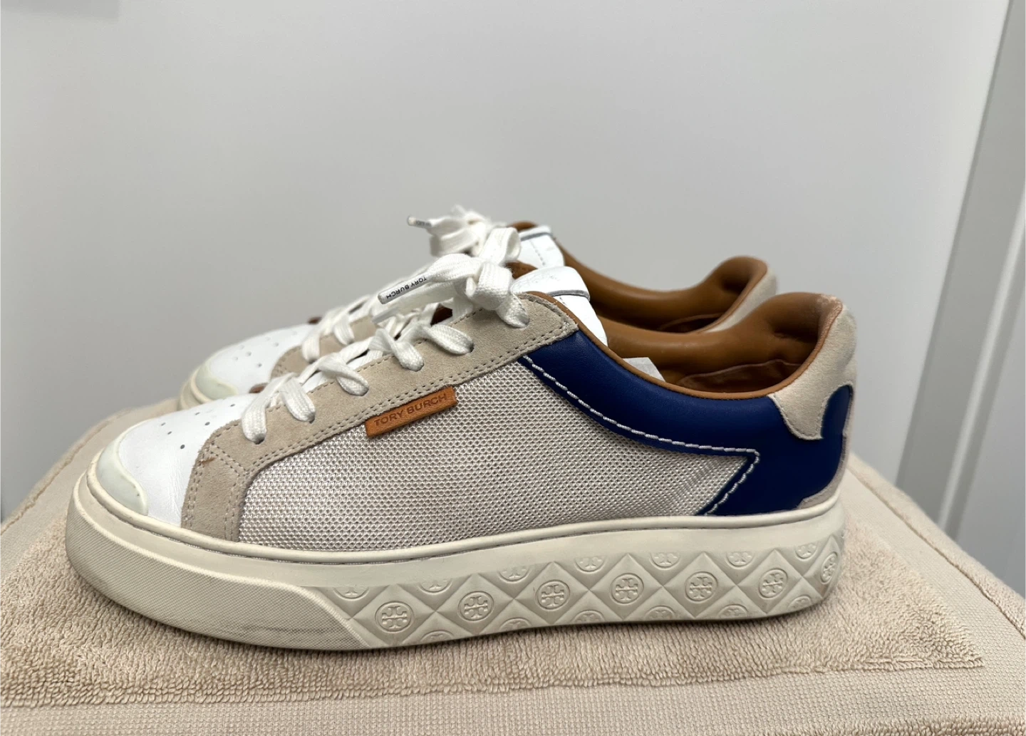 Selling a pair of Tory Burch sneakers in size 10(27.5cm) The upper is made of leather and textile, with a leather lining and rubber outsole.