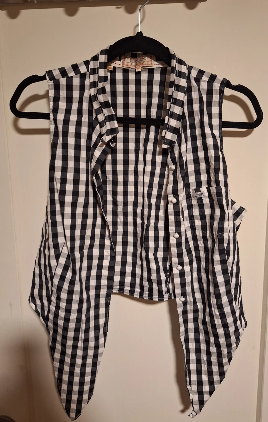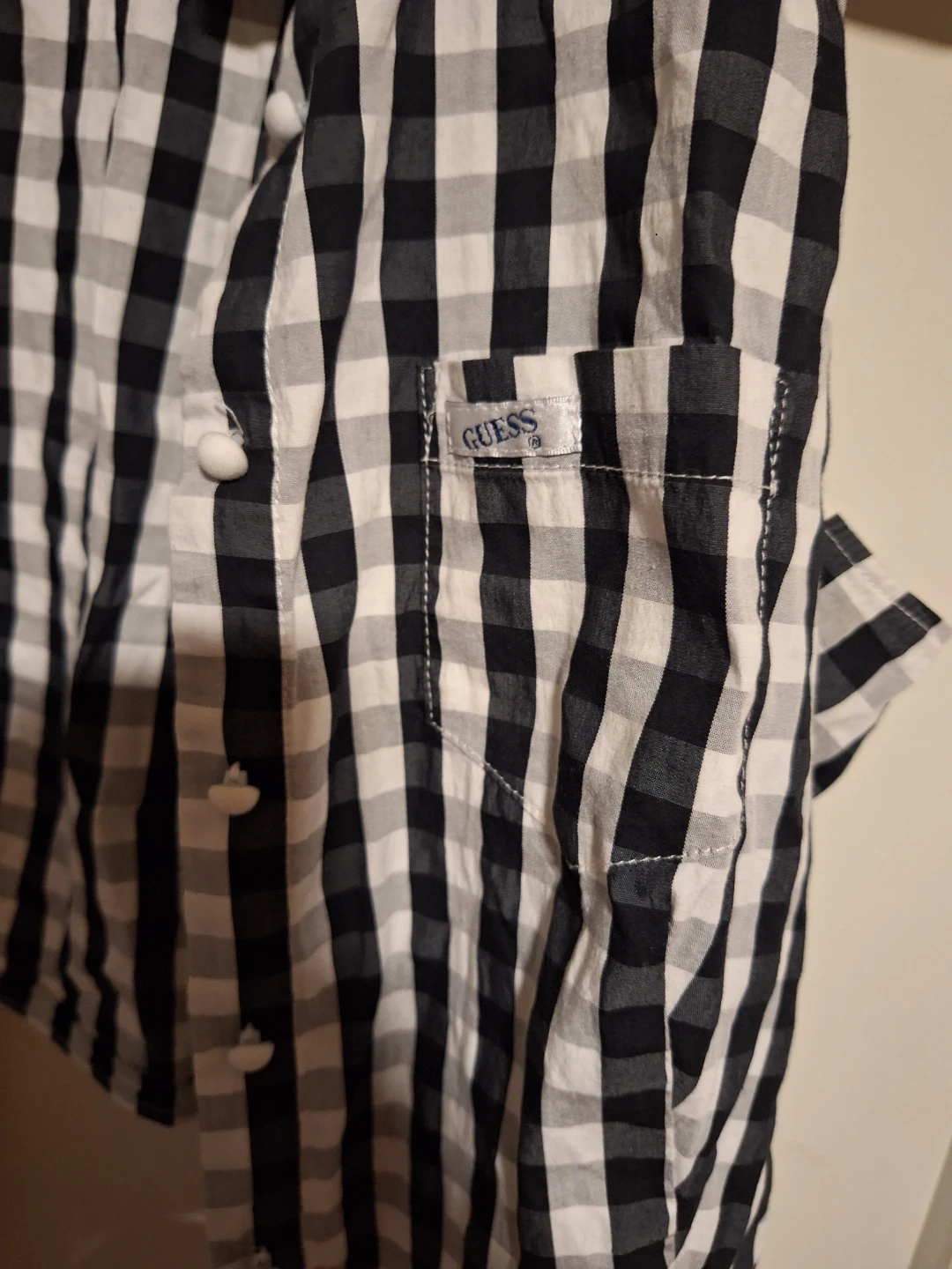 Selling a Guess vest in a black and white gingham pattern. It's a size XL and in great condition. Perfect for layering or adding a bit of retro flair to your outfit!