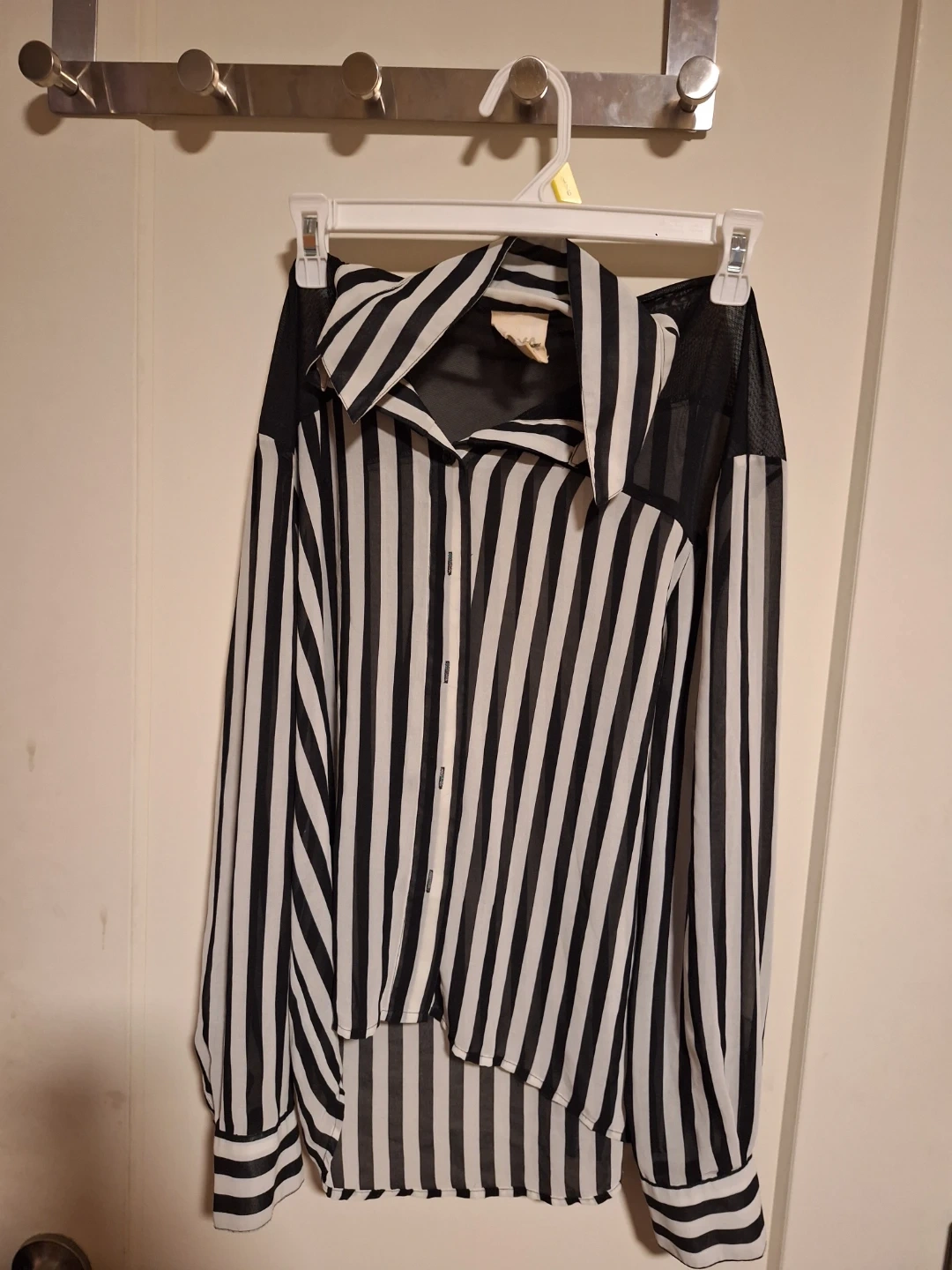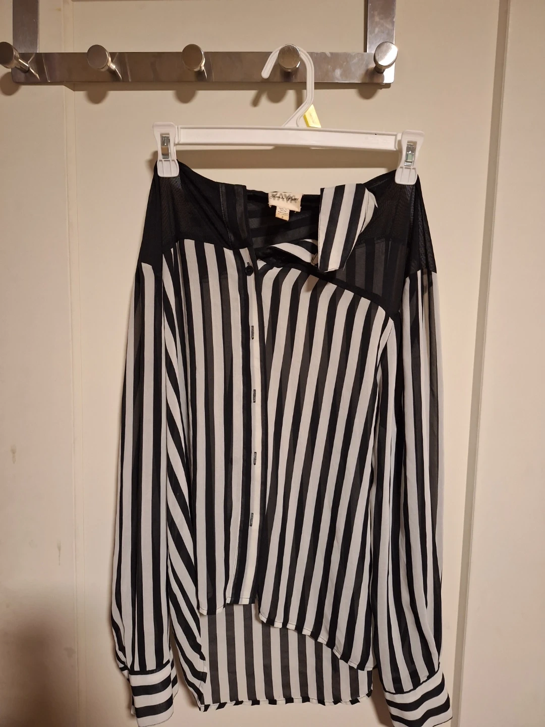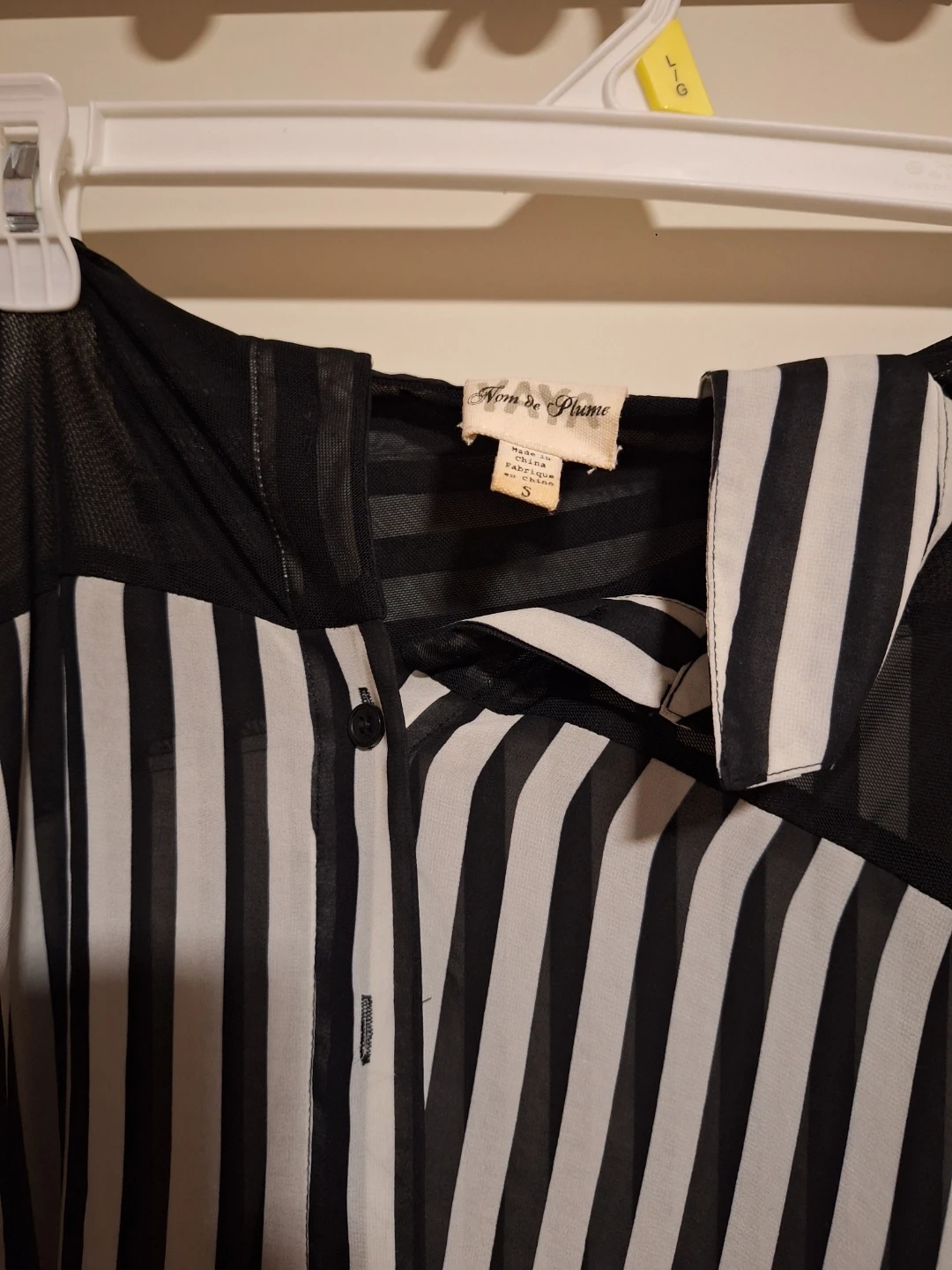 Here's a stylish Nvm de Phame blouse in a striking black and white striped pattern! It's a size small and features a unique design with sheer black mesh detailing. Perfect for adding a touch of chic to any outfit!