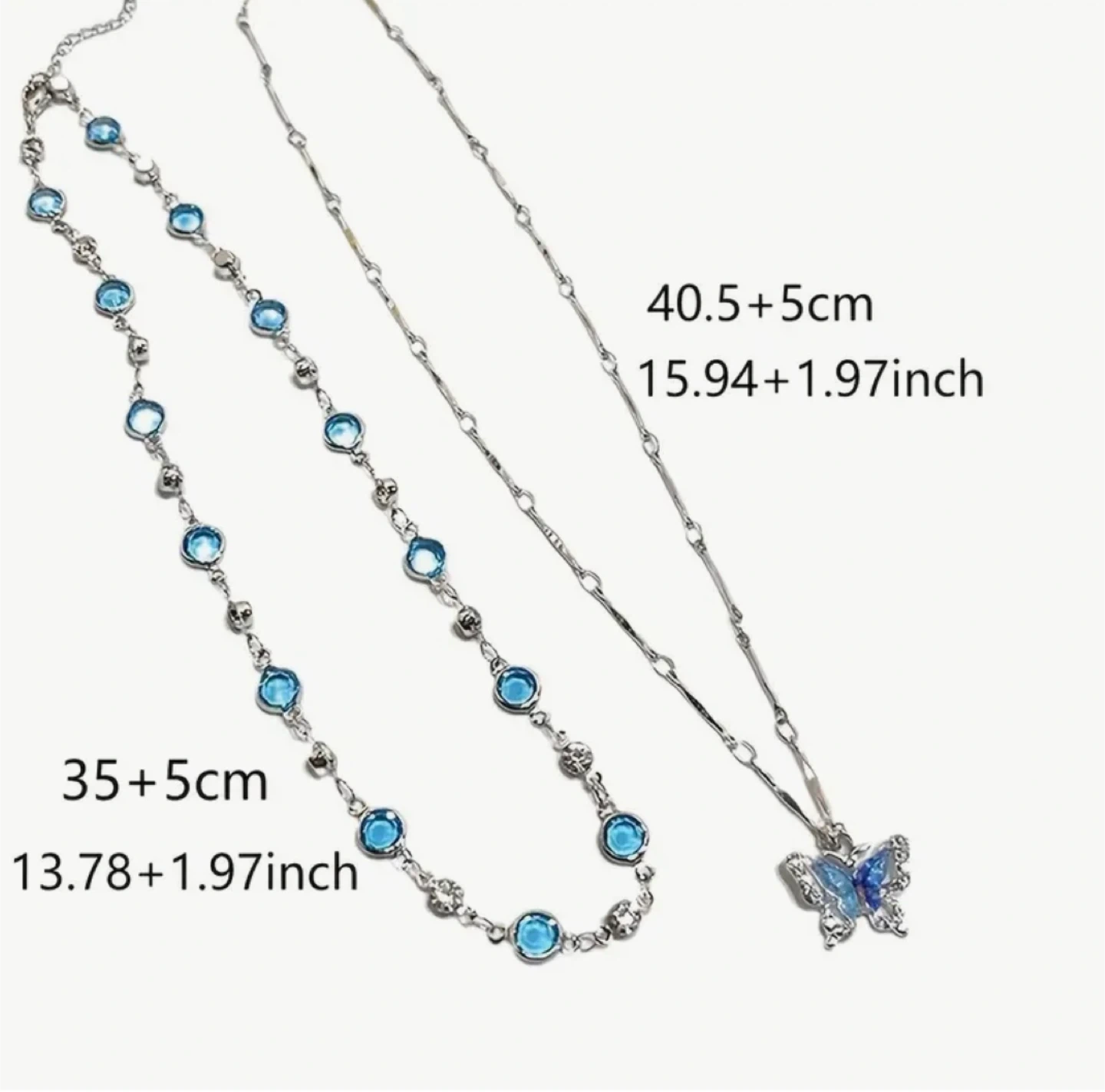 This is a beautiful necklace set with a butterfly pendant. The set includes two necklaces, one with a butterfly pendant and another with blue stones. The necklaces are silver in colour. The lengths are approximately 13.78 + 1.97 inches and 15.94 + 1.97 inches
