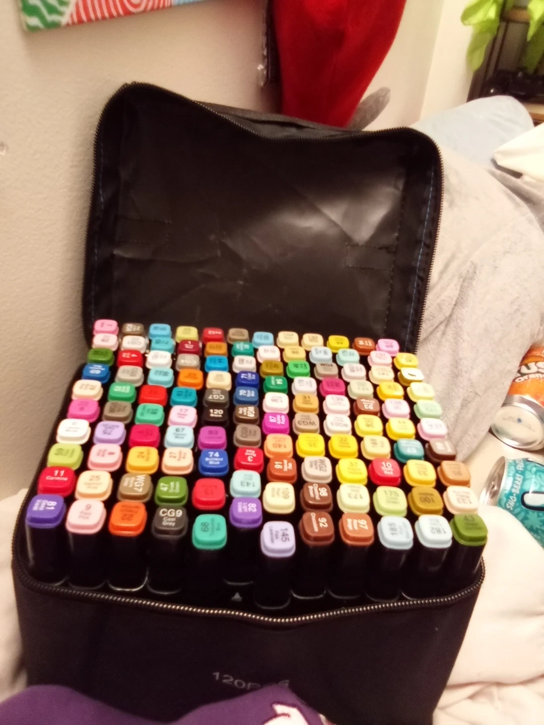 Selling a set of 120 colouring markers! They come in a convenient carrying case, perfect for artists of all levels. The markers are vibrant and great for various art projects