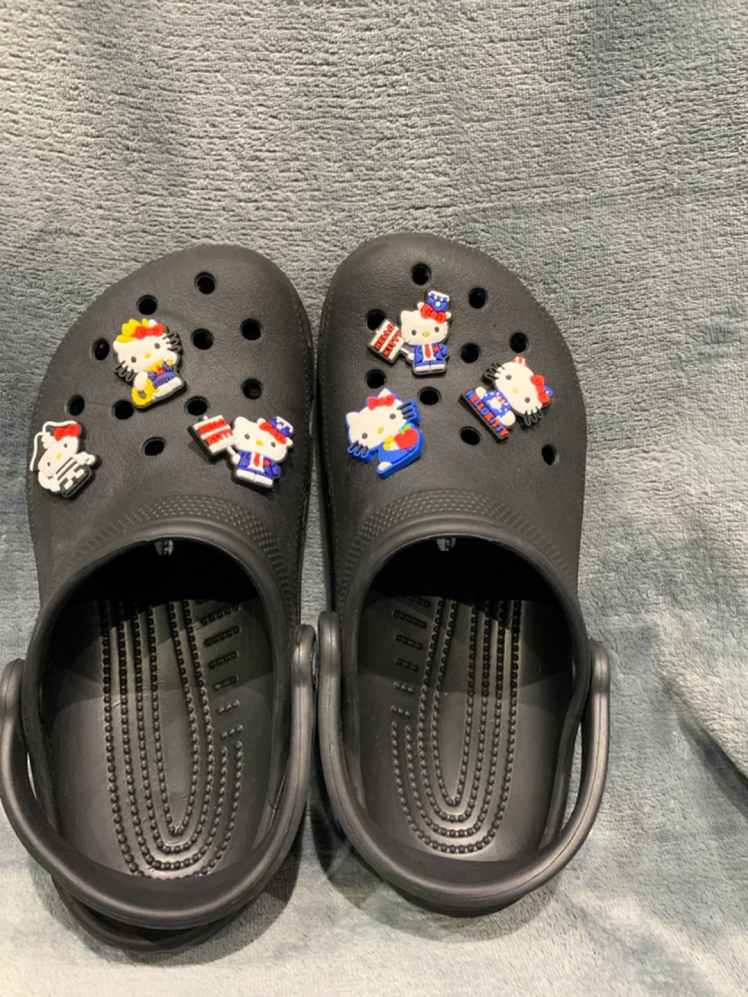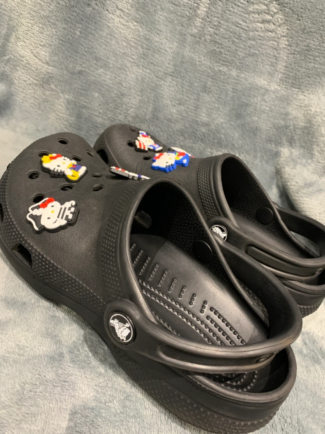 Selling a pair of black Crocs Classic clogs in size J4. They come with some cute Hello Kitty charms. They are in good condition and ready for a new owner!