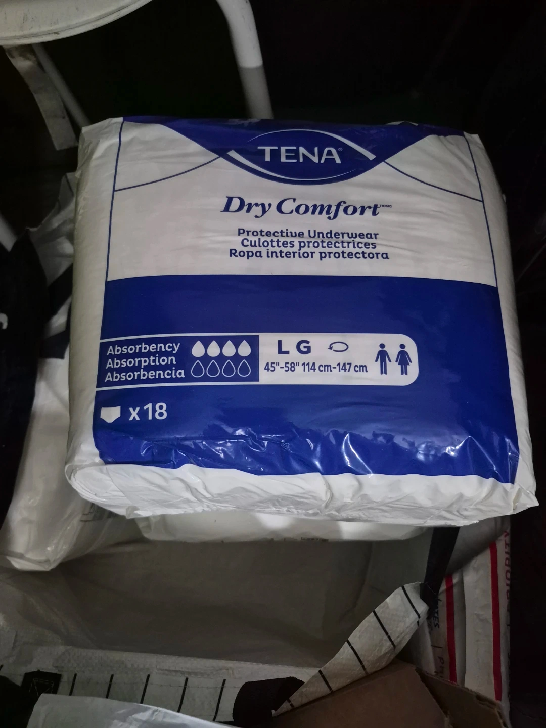 Selling a pack of TENA Dry Comfort protective underwear. These are size Large (45"-58" / 114 cm-147 cm). The pack contains 18 pairs of protective underwear.