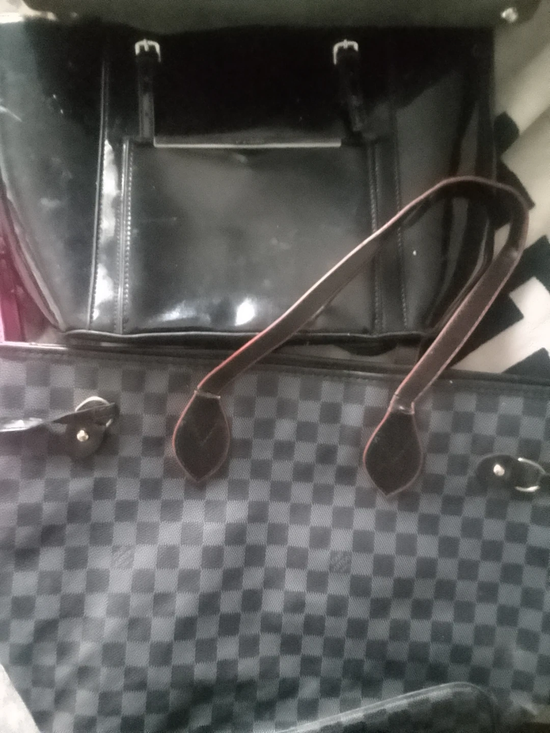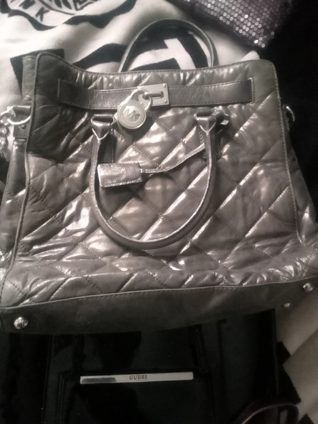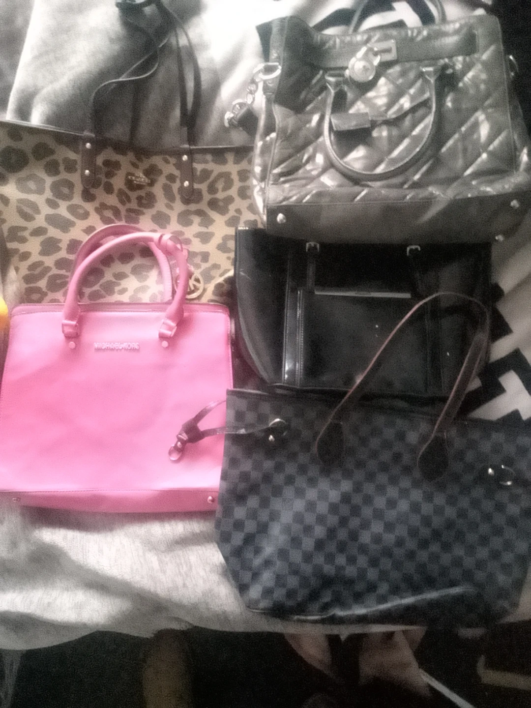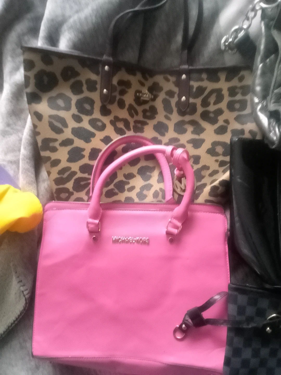A collection of tote bags including a Michael Kors pink tote, a Coach leopard print tote, and a grey quilted Michael Kors tote, guess