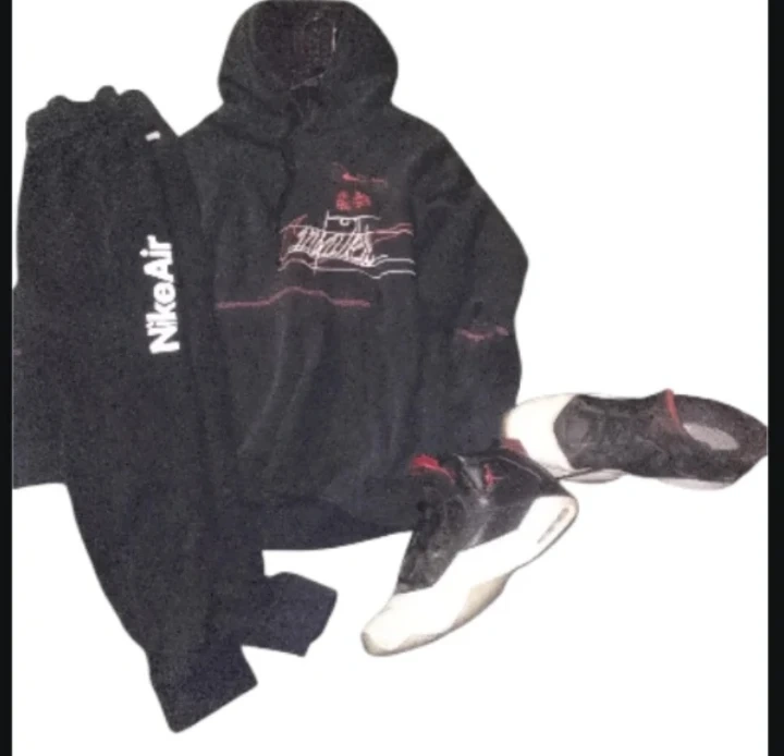 Selling a Nike Air black tracksuit and a pair of Jordan sneakers. They are in used condition, as seen in the photos. Great for casual wear!