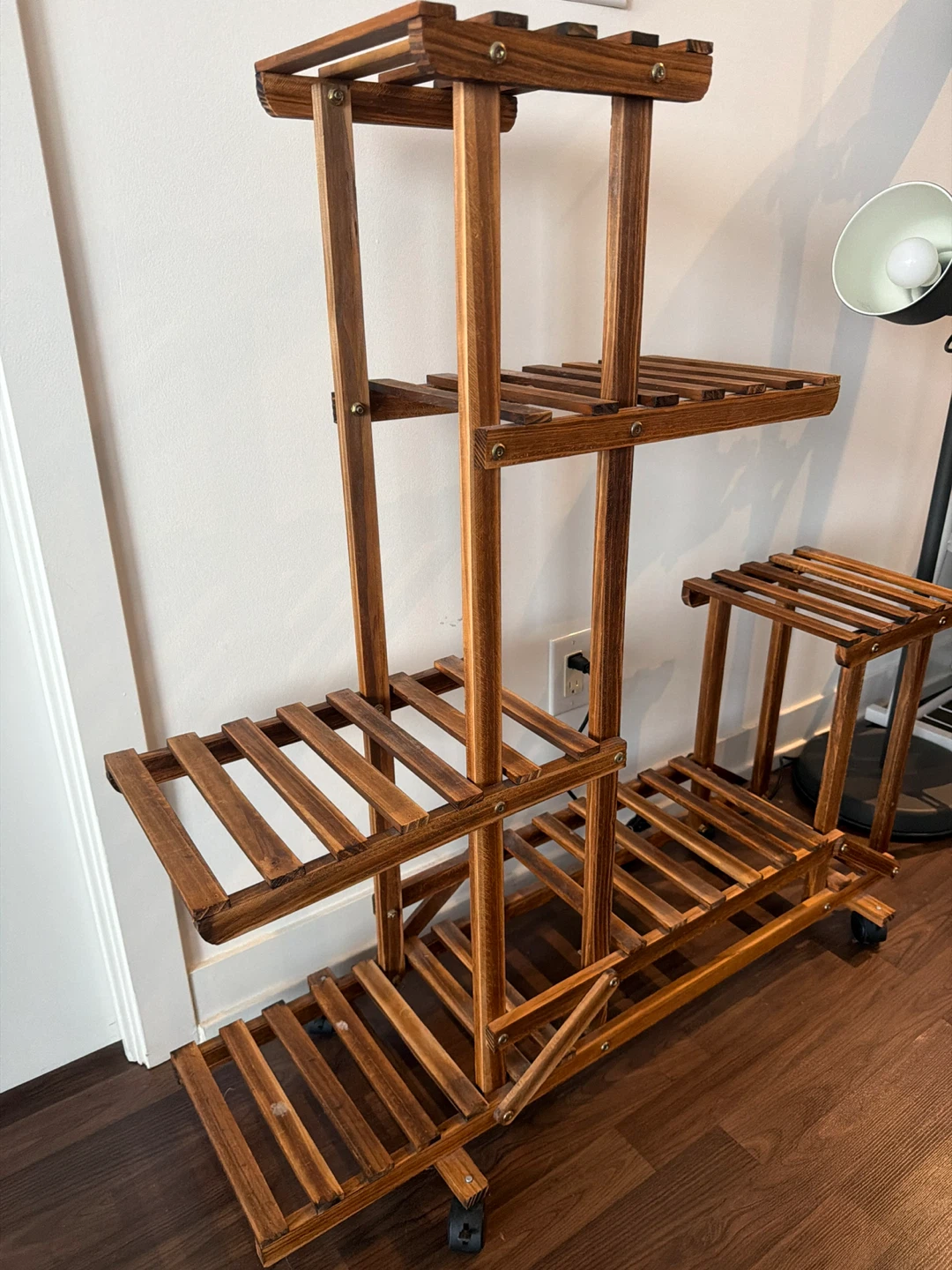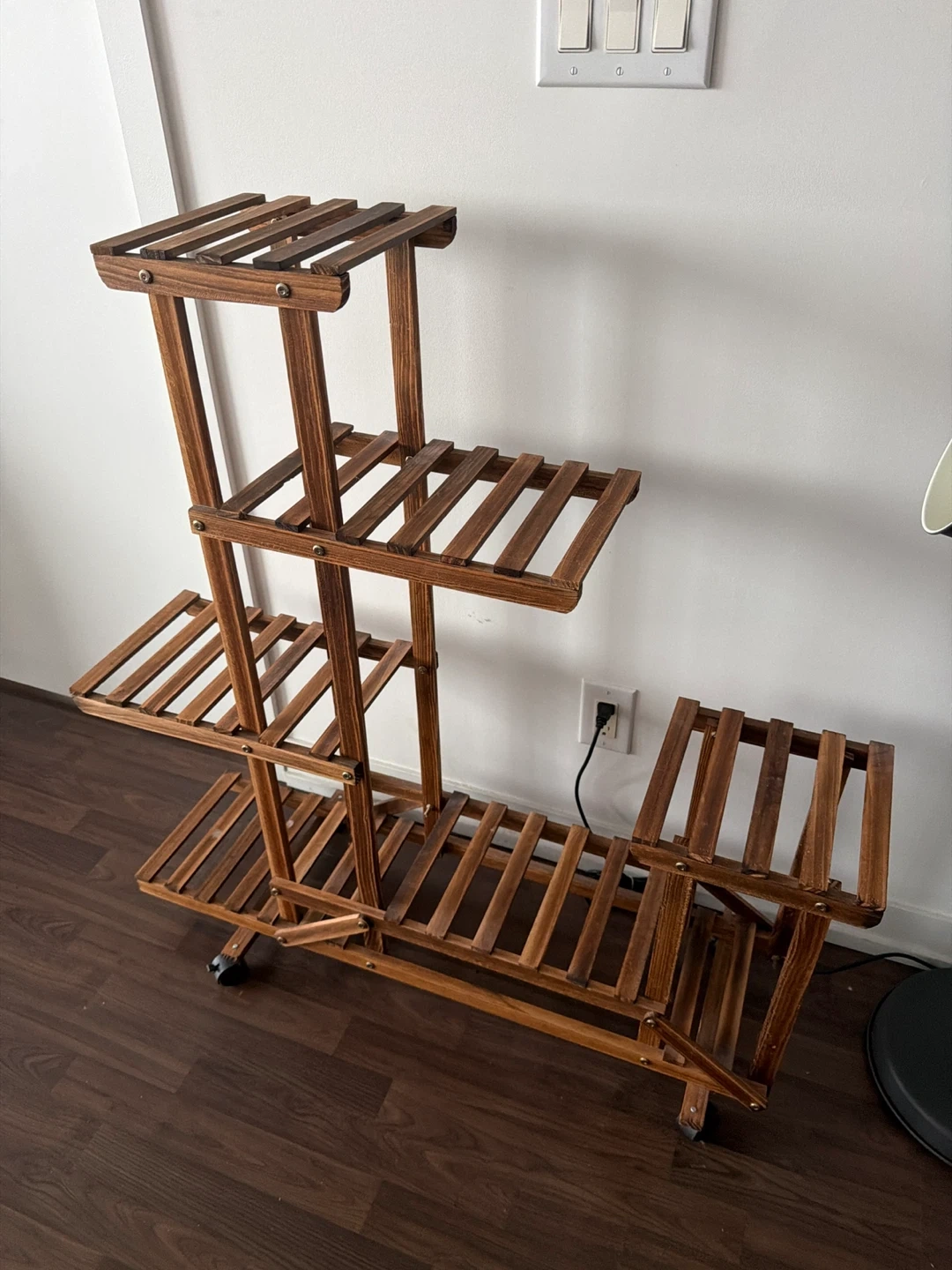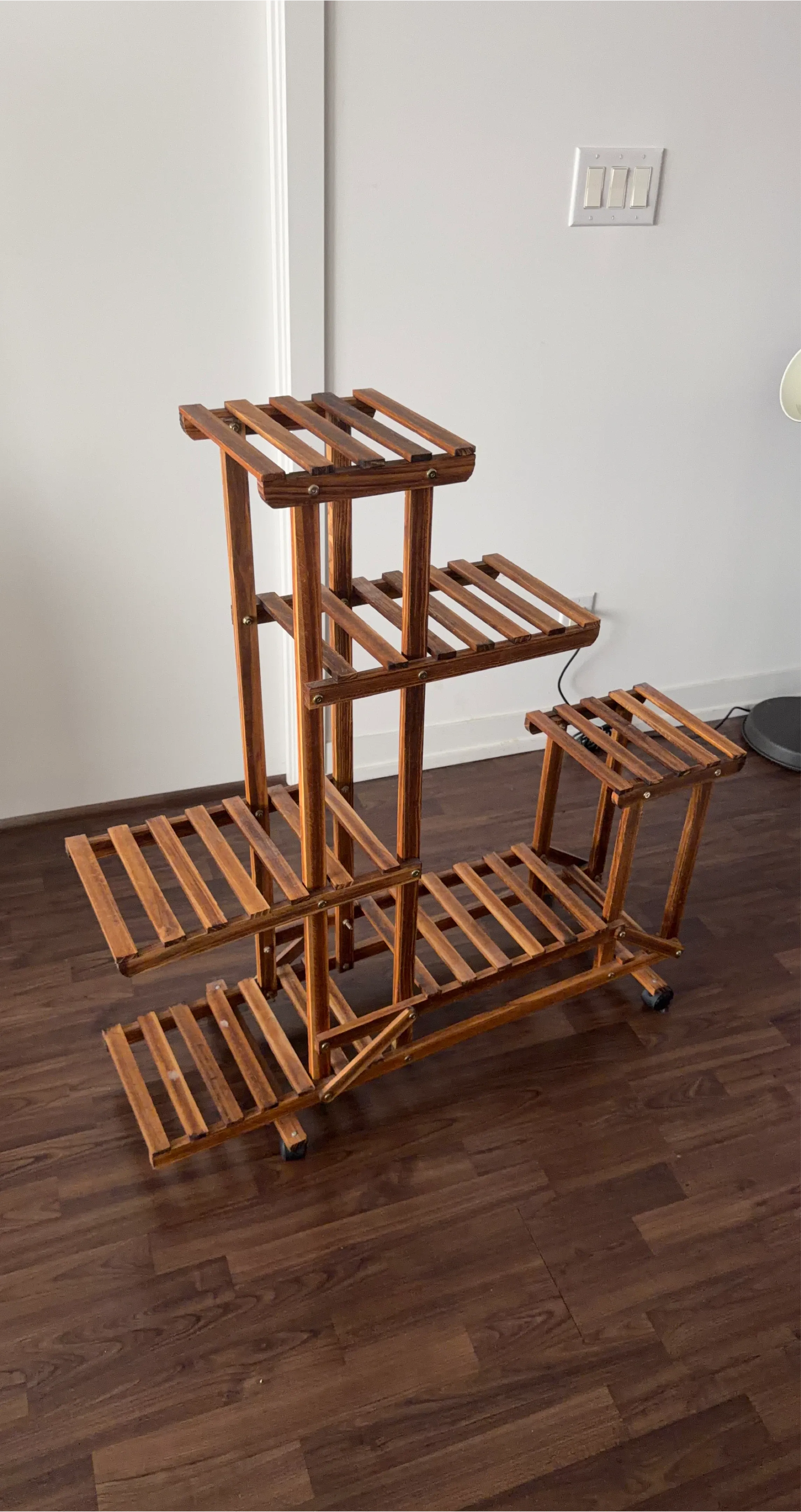 Selling a multi-tiered wooden plant stand! It's perfect for displaying your plants indoors or outdoors. It has multiple levels to accommodate different sized pots and adds a nice touch to any space. It's in great condition and ready for a new home!