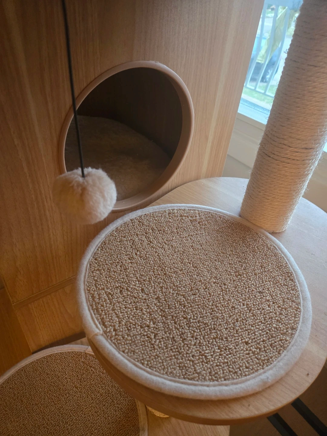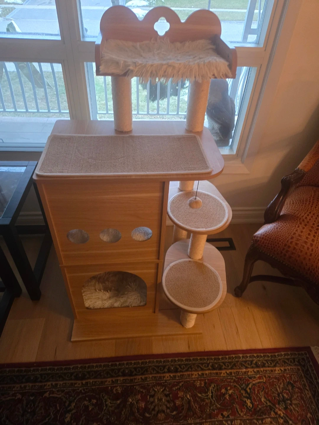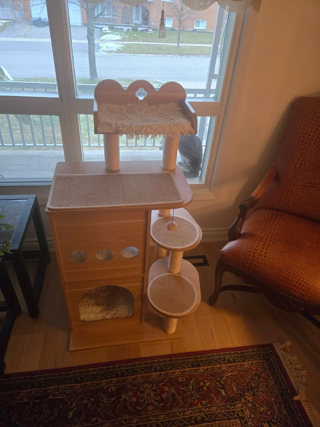 Selling a used cat tree/condo with scratching posts. It's in exellent condition and has multiple levels for your cat to explore and play on. It has a cute little condo area and a dangling ball toy for your kitty’s entertainment!