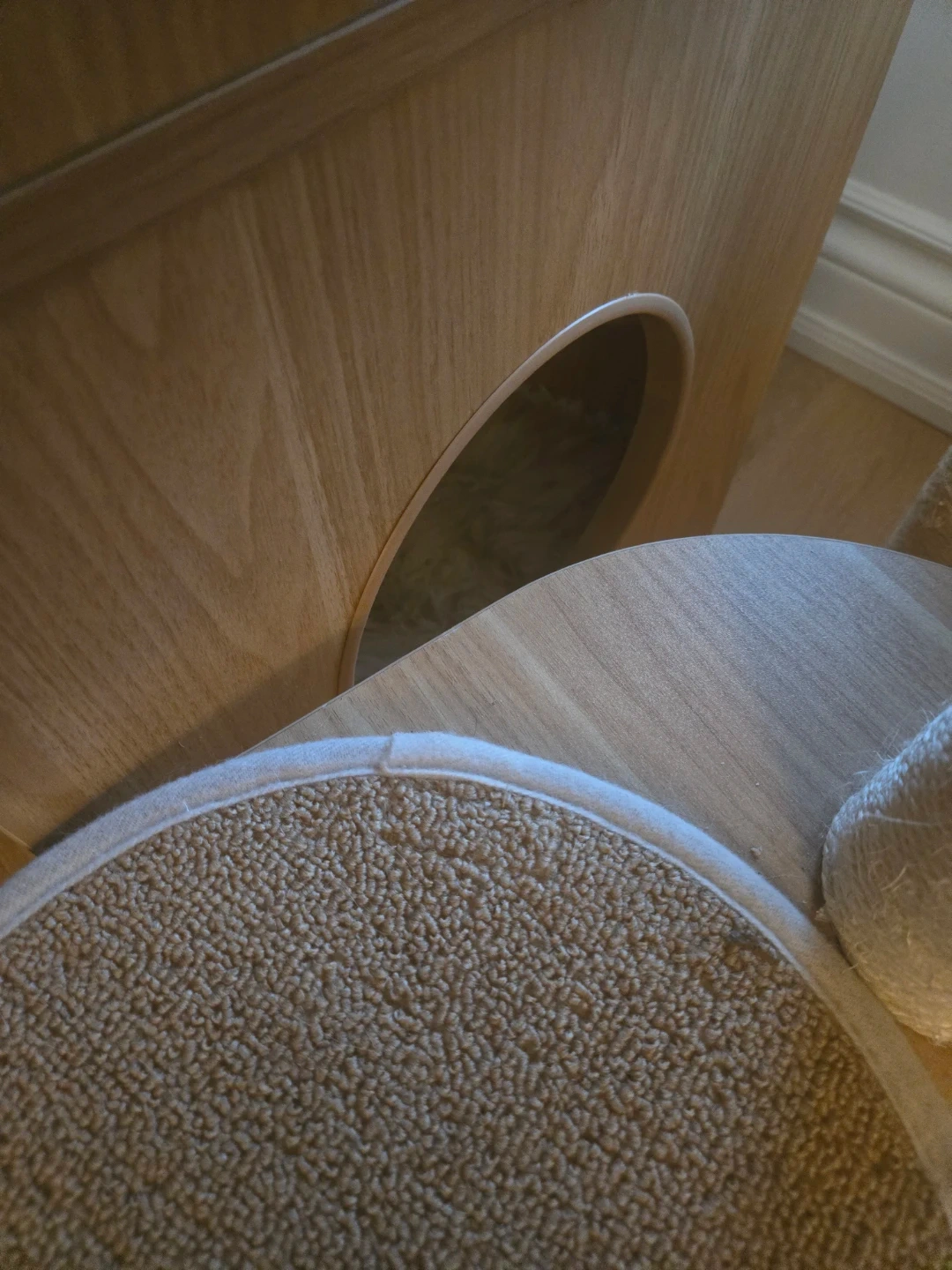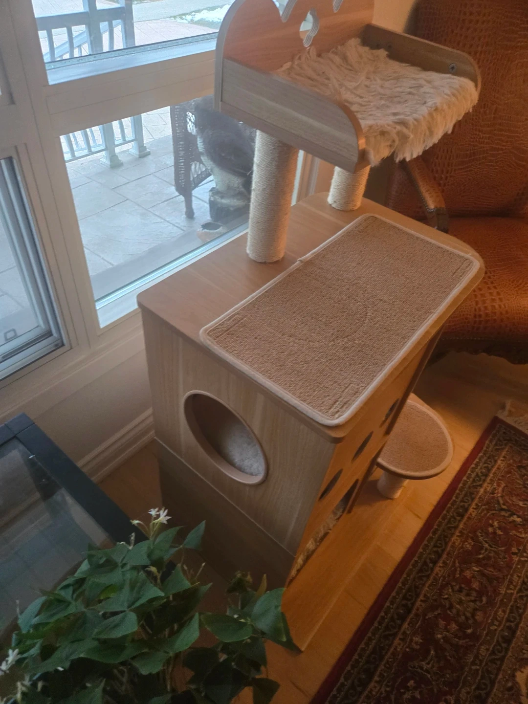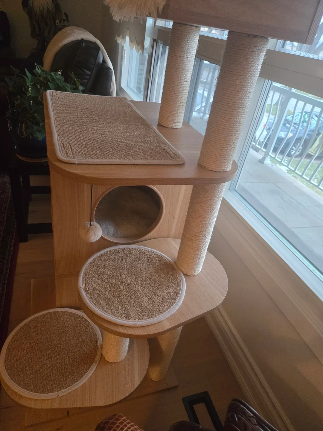 Selling a used cat tree/condo with scratching posts. It's in exellent condition and has multiple levels for your cat to explore and play on. It has a cute little condo area and a dangling ball toy for your kitty’s entertainment!