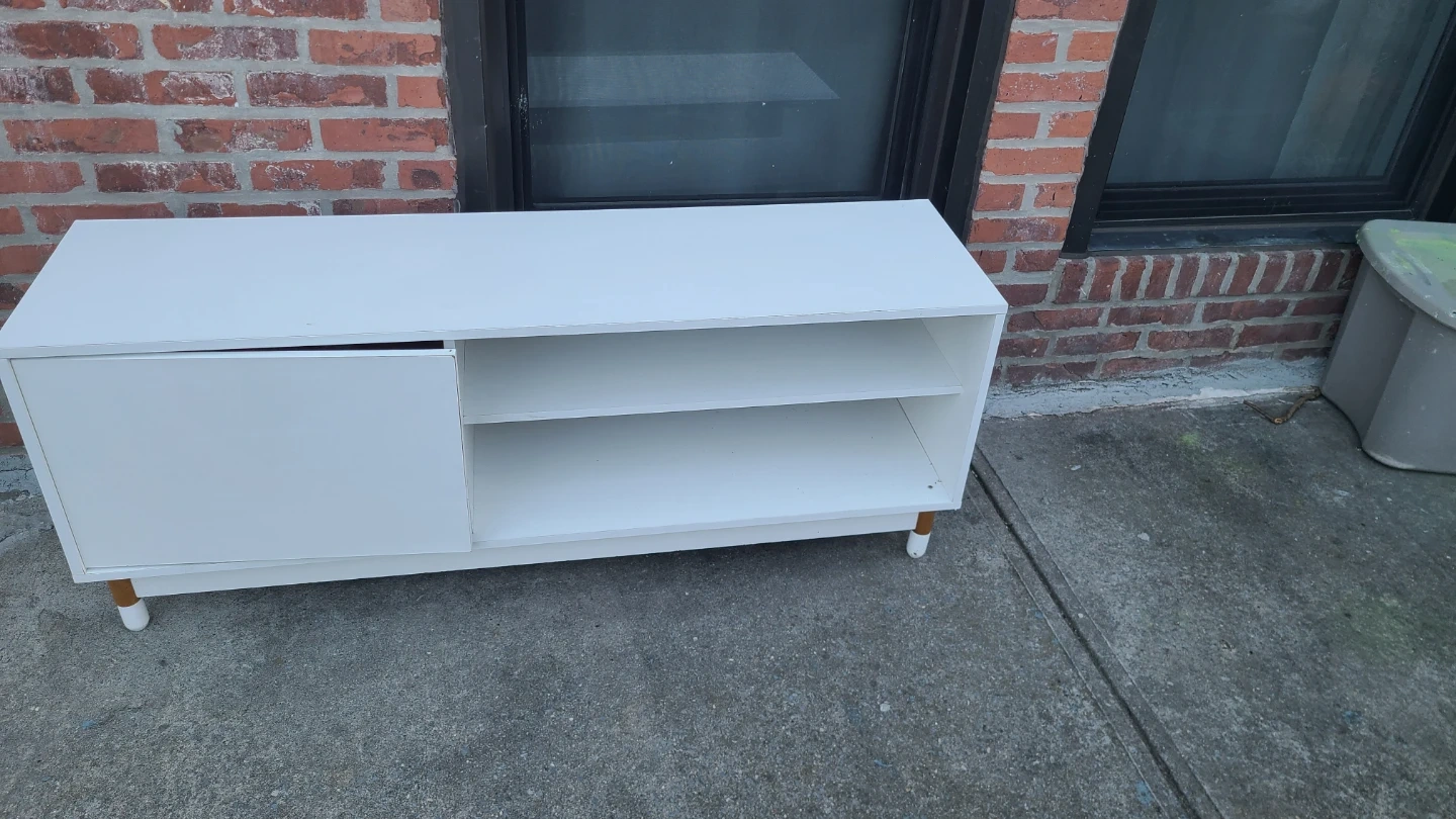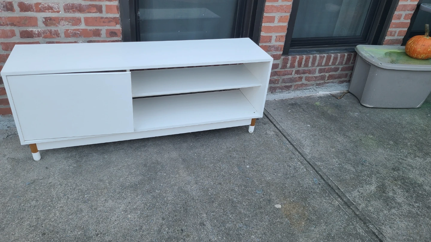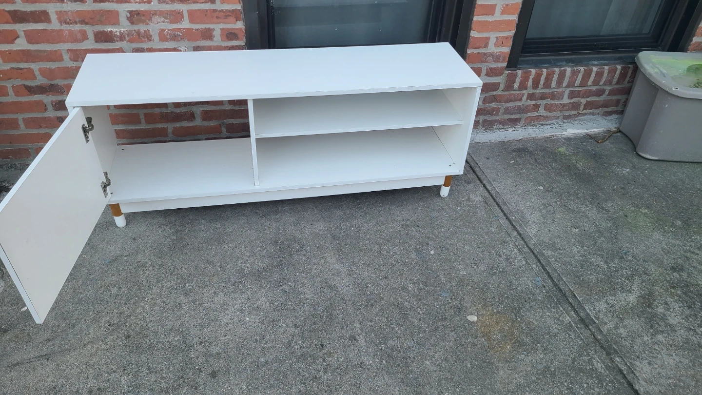 Selling a white media console with open shelves. It's in good condition and perfect for organizing your entertainment area. It has a clean, minimalist look that fits well in any room.