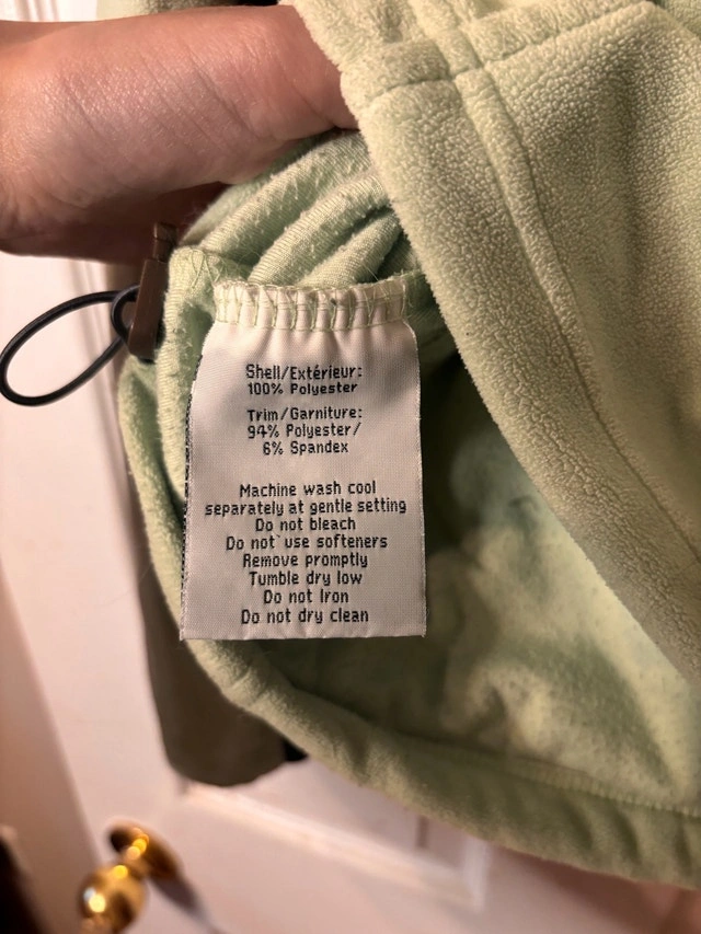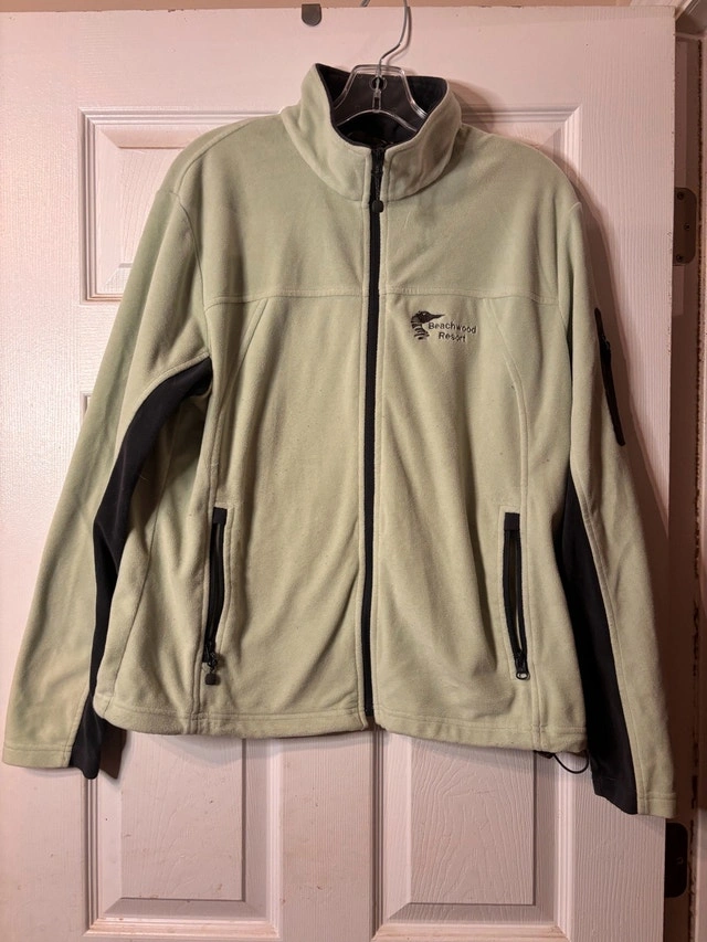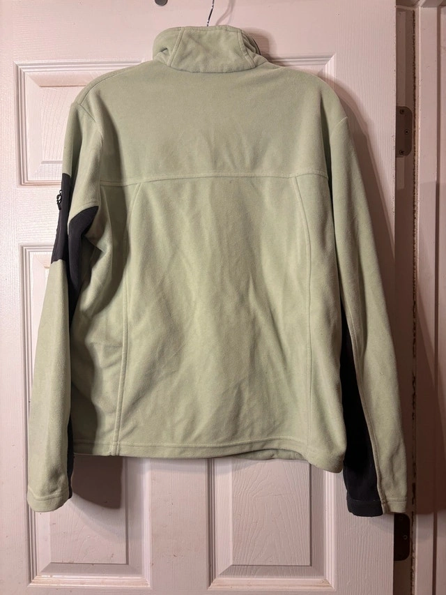 $15 or best offer - Comfortable zip-up fleece jacket in a soft sage green colour with dark contrast panels. Lightweight and easy to wear — great for casual outings, travel, or layering. Made from 100% polyester, easy-care and warm without being bulky. Details: