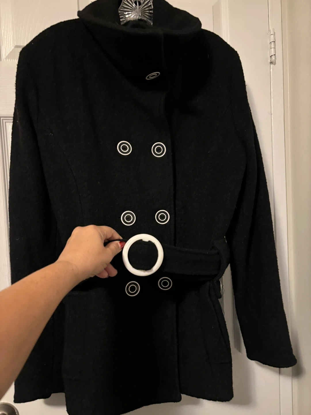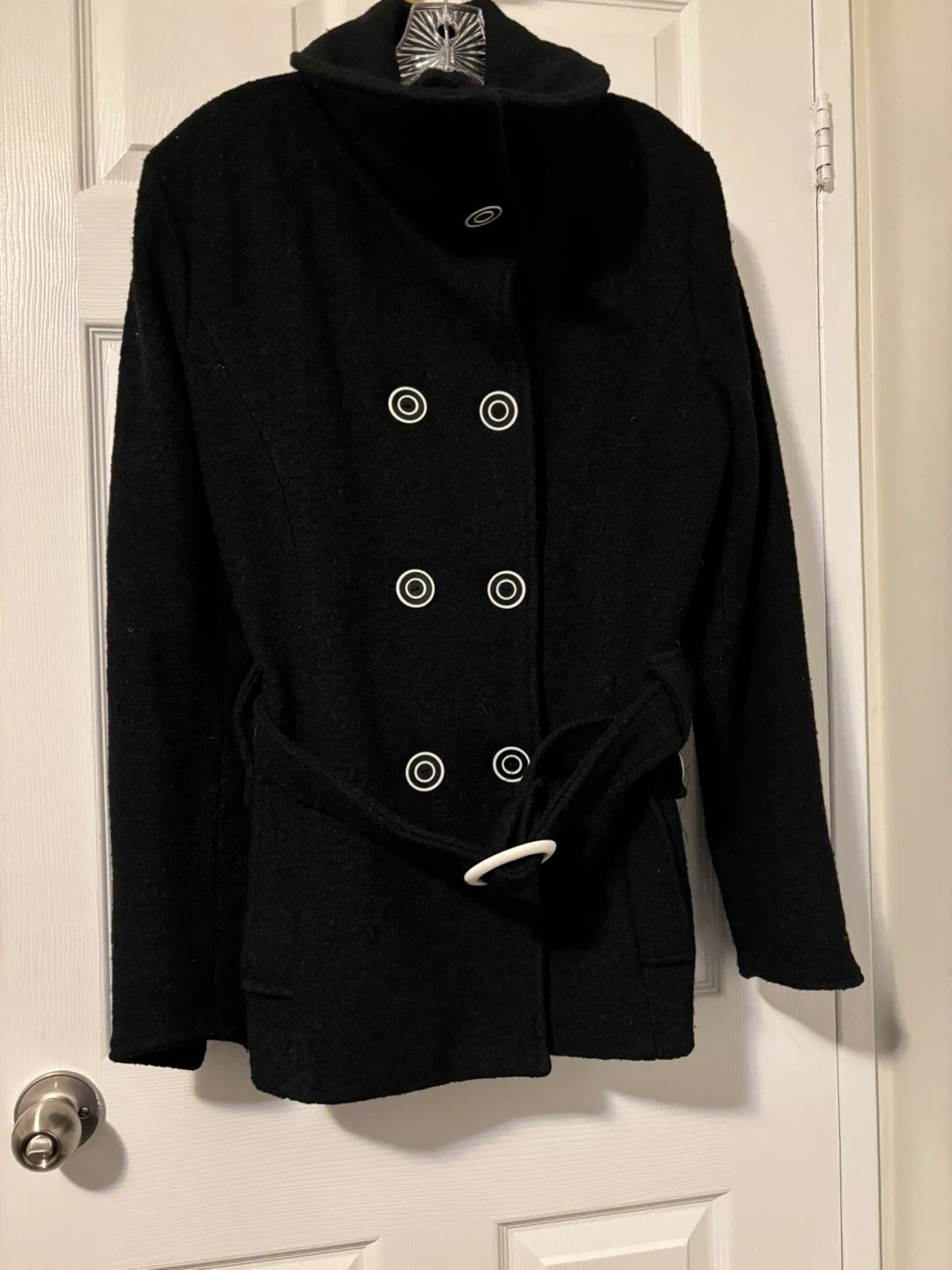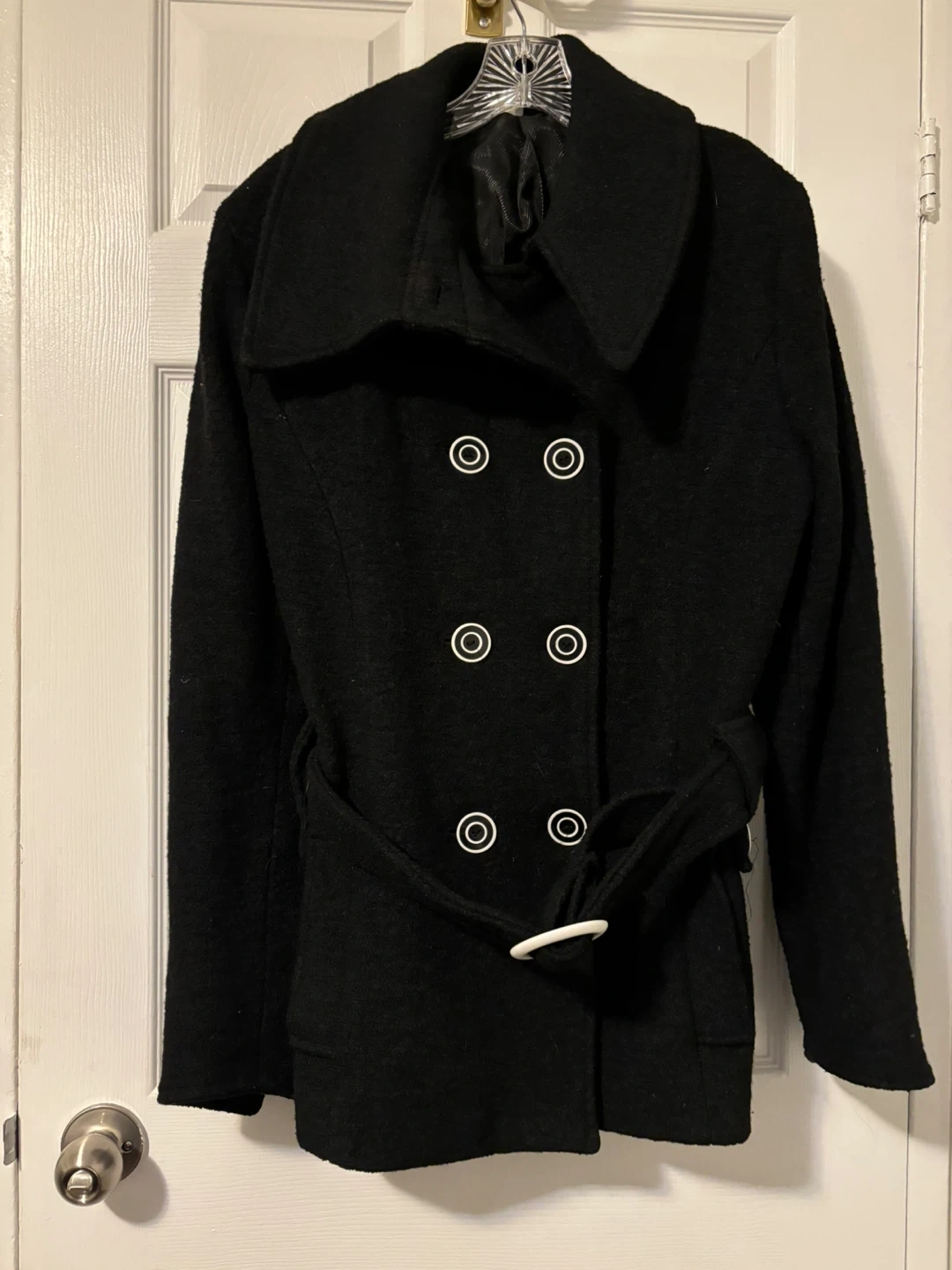 Selling a stylish black pea coat with a belted waist. It features a double-breasted design with white buttons. Perfect for keeping warm and looking nice:)