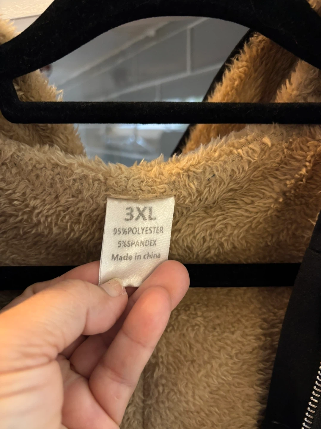 Cozy black winter coat, size 3XL! The inner lining is a soft, plush material, perfect for staying warm on chilly days. The outer shell is 95% polyester and 5% spandex.