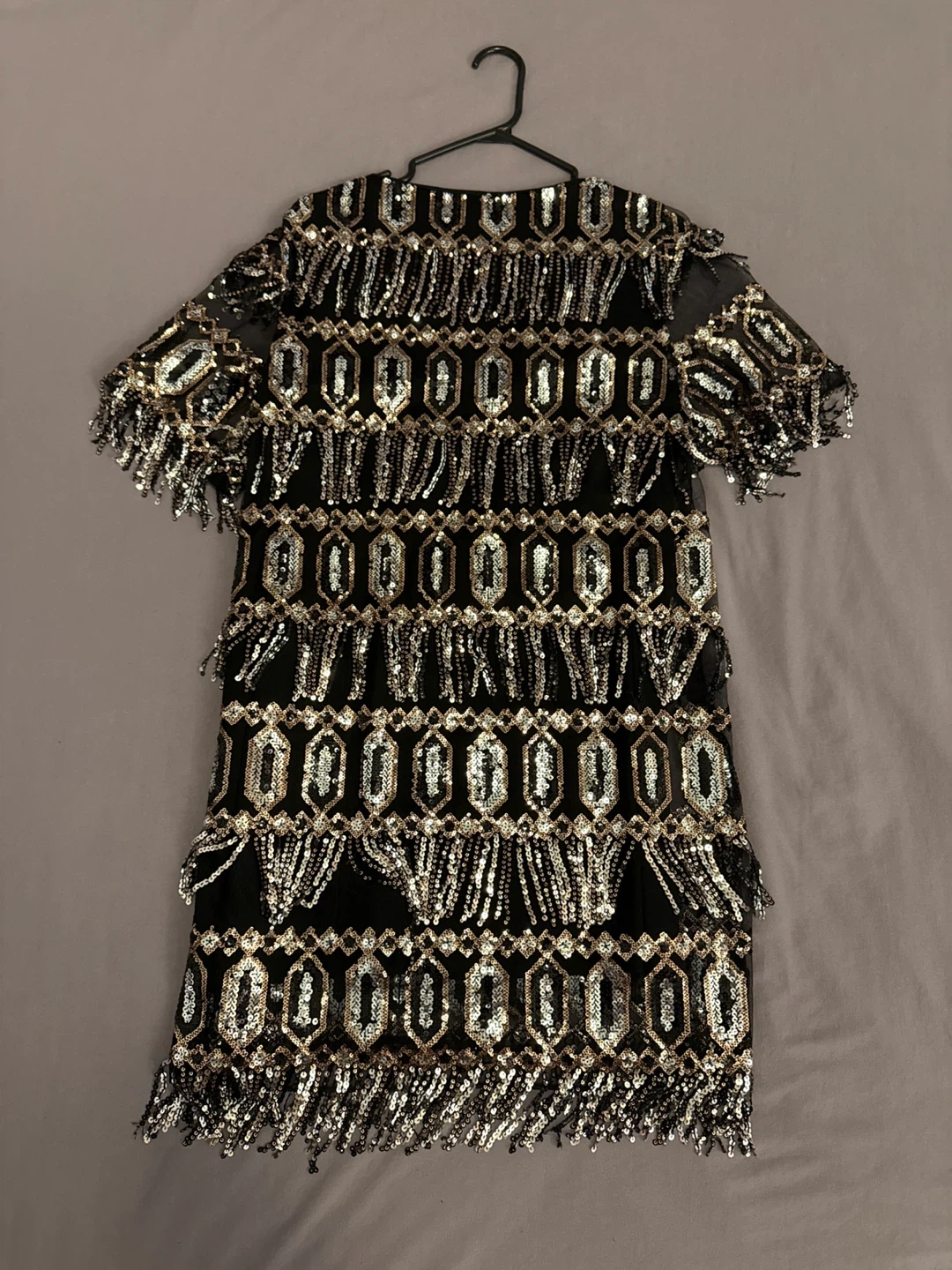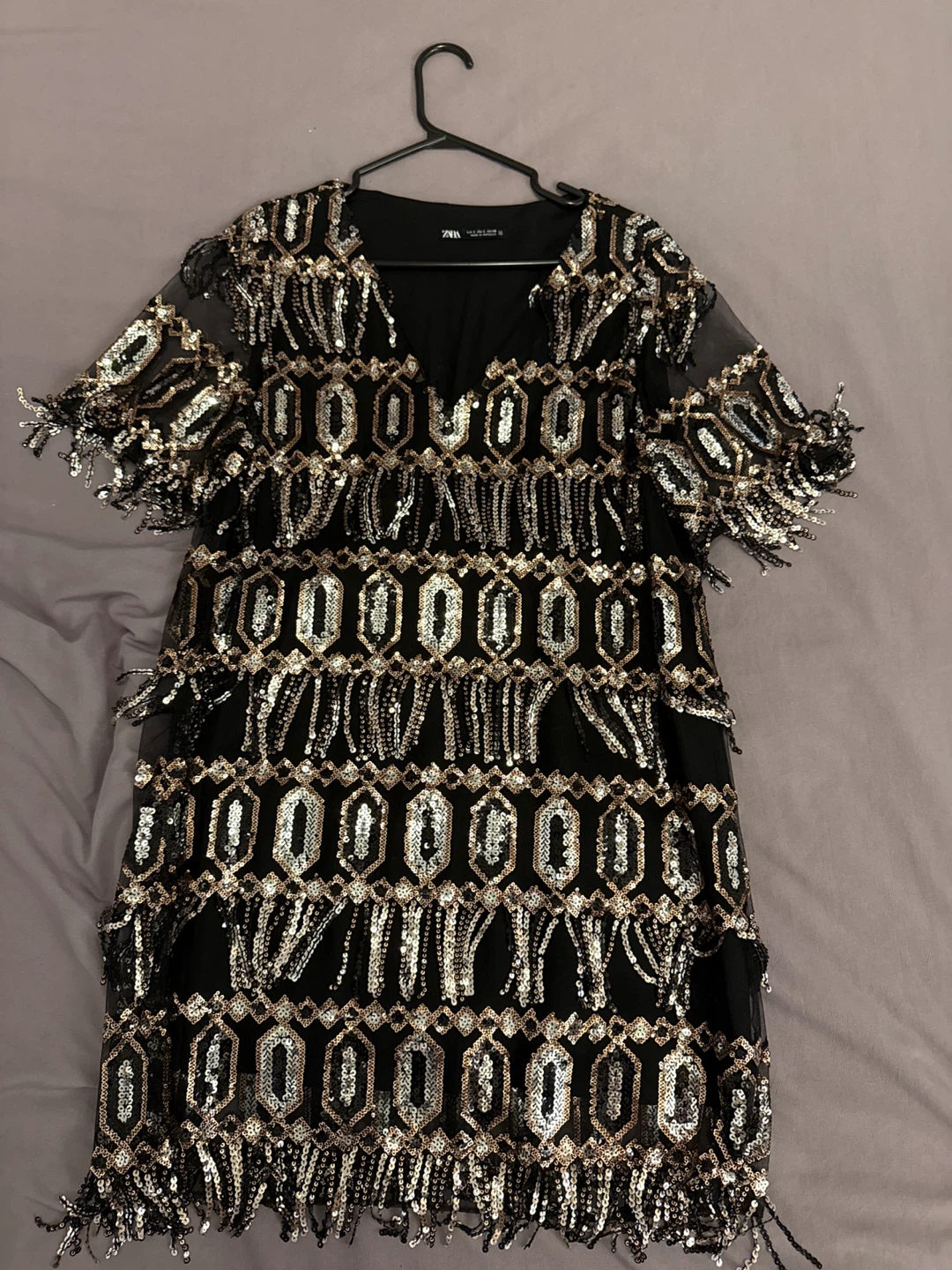 Selling a Zara dress with beautiful sequin embellishments! It's a size small and in great condition. The dress is black with gold and silver sequins, perfect for a night out or a special occasion. Made in Morocco!