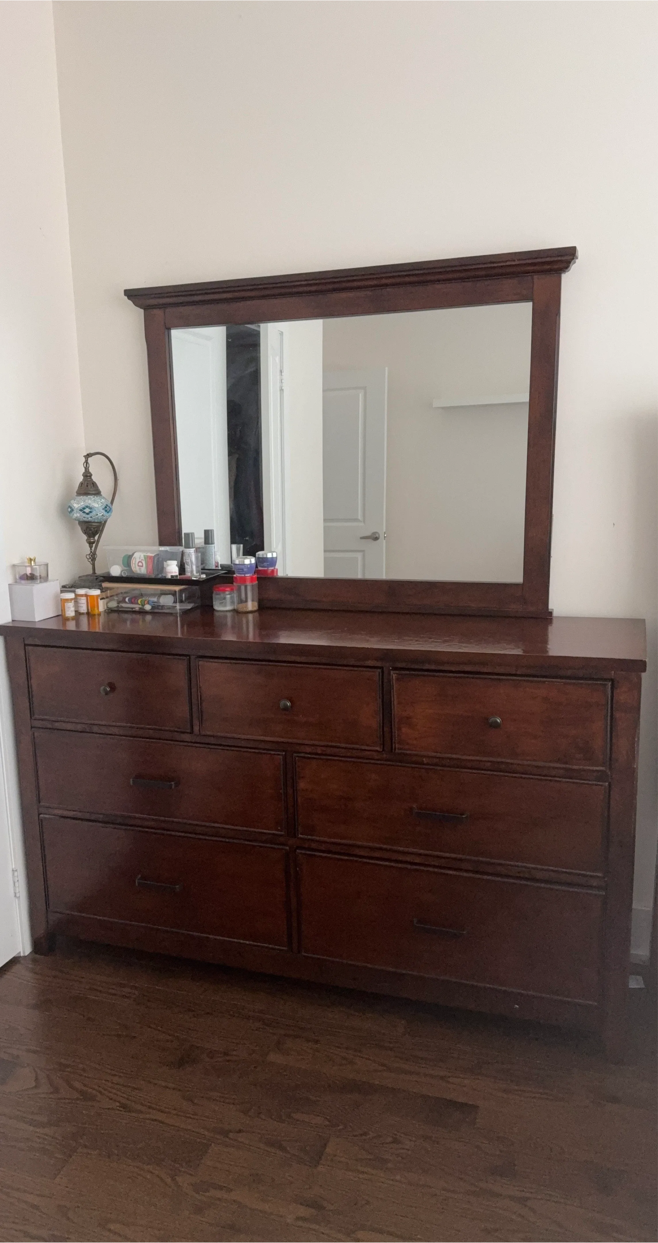 Here's a lovely wood dresser with a mirror. It's in good condition and has plenty of storage space with its multiple drawers. Perfect for adding some classic style to your bedroom!