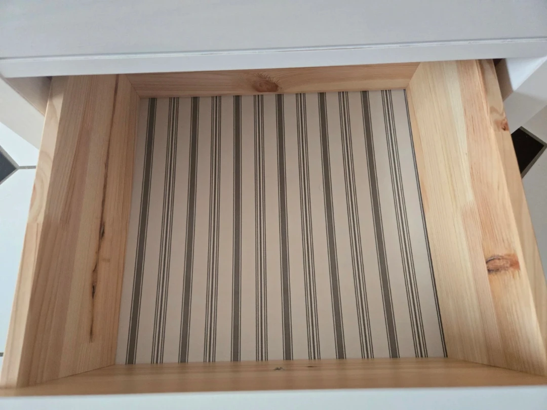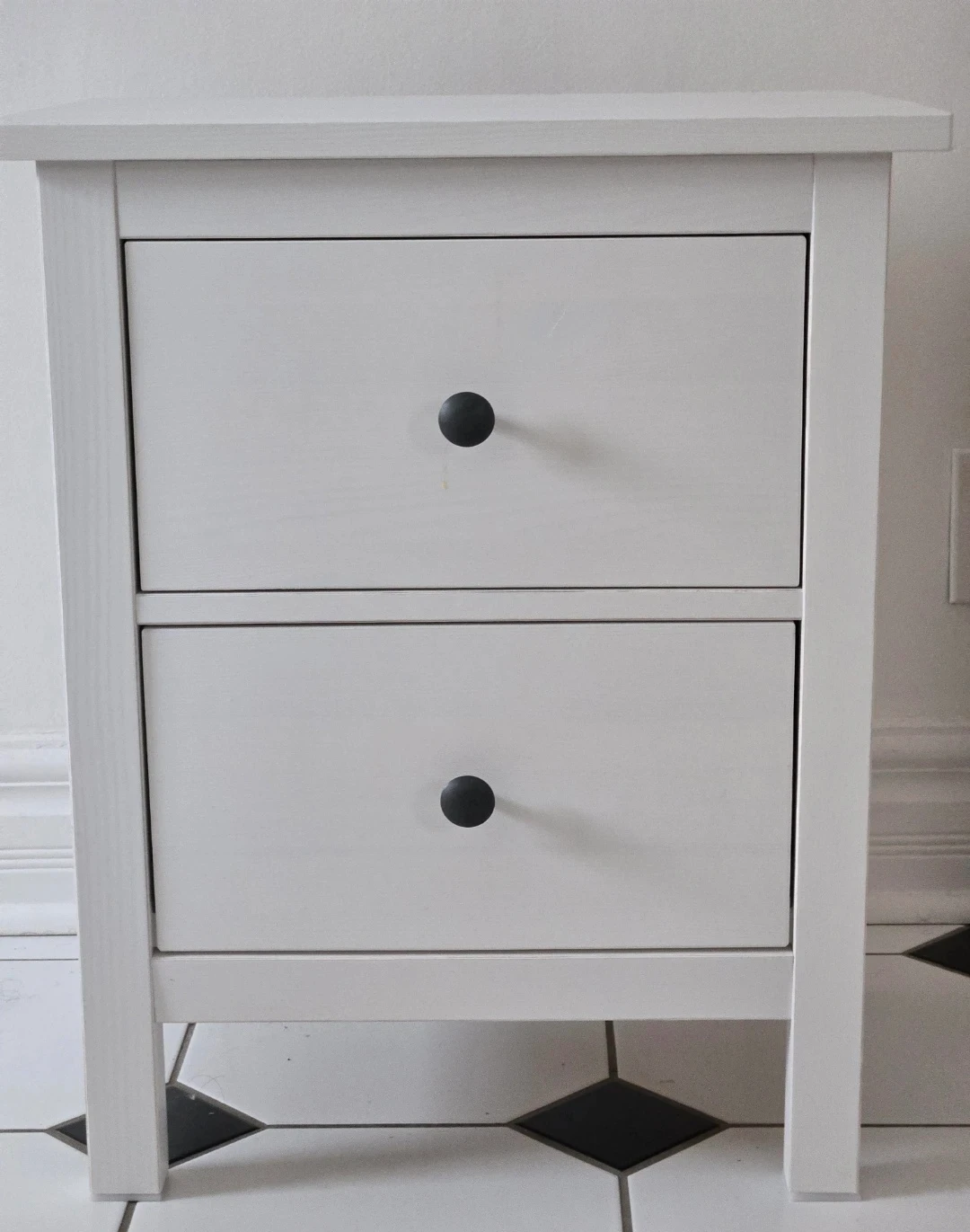 Selling an IKEA Hemnes nightstand in white stain. It features two drawers for convenient storage. The inside of the drawers have a striped pattern. Perfect for adding a touch of Scandinavian style to your bedroom! Its in excellent condition.