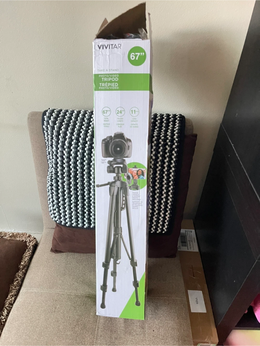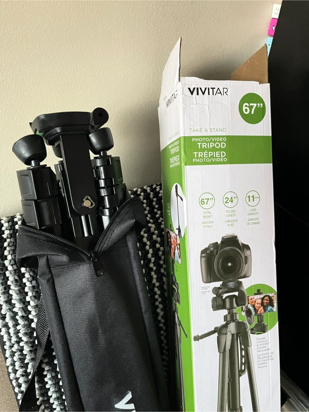 Selling a brand new Vivitar 67" Photo/Video Tripod! It's still in its original box and includes the carrying bag. This tripod can extend to a total height of 67 inches and folds down to 24 inches for easy transport. It has a load capacity of 11 lbs, making it suitable for various cameras and devices. Perfect for capturing those steady shots!