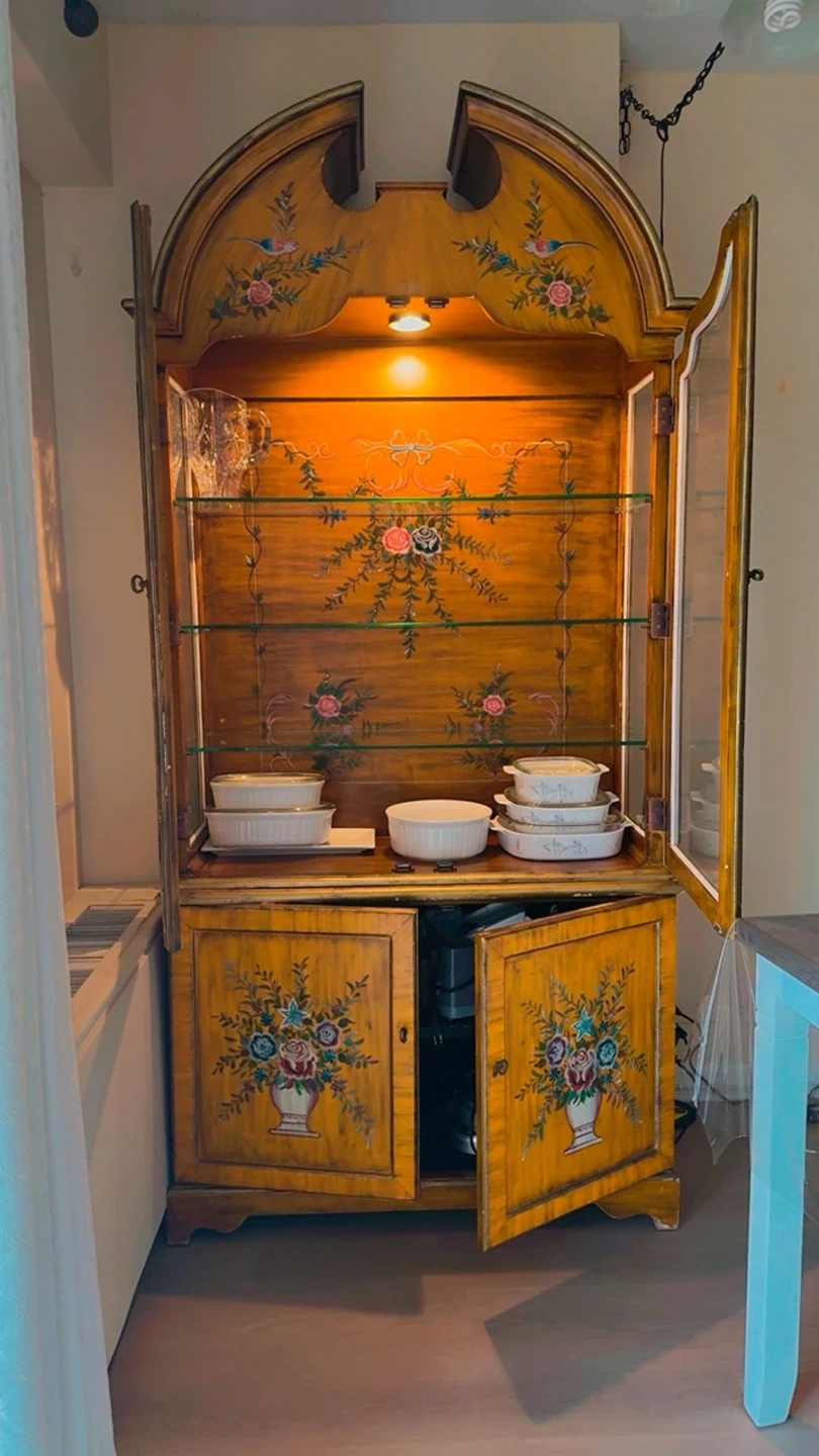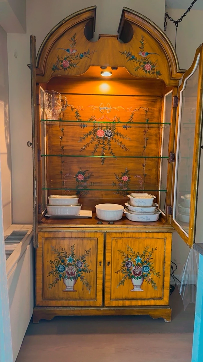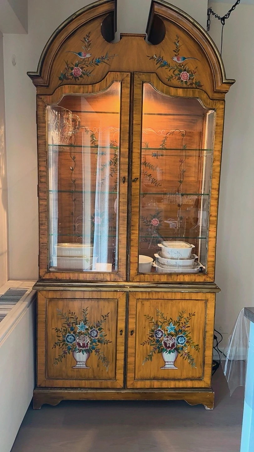 Selling a vintage wooden china cabinet featuring beautiful hand-painted floral designs. This unique piece adds a touch of old-world charm to any room. It has glass shelves and interior lighting to showcase your favorite items. Its a reproduction of Egyptian style