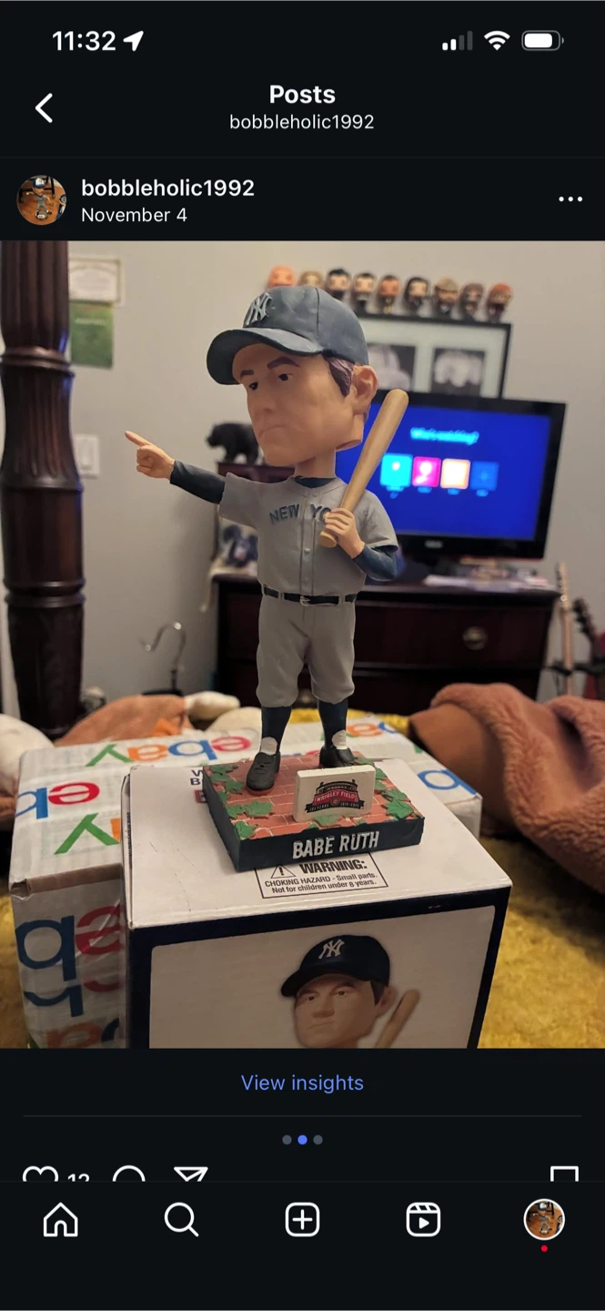 Selling a Babe Ruth bobblehead figurine. The figurine is on a base that resembles Wrigley Field. The base also has Babe Ruth's name on it. It comes with the original box!