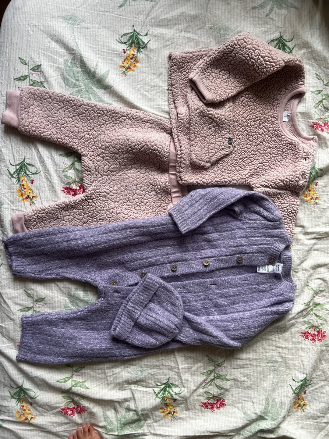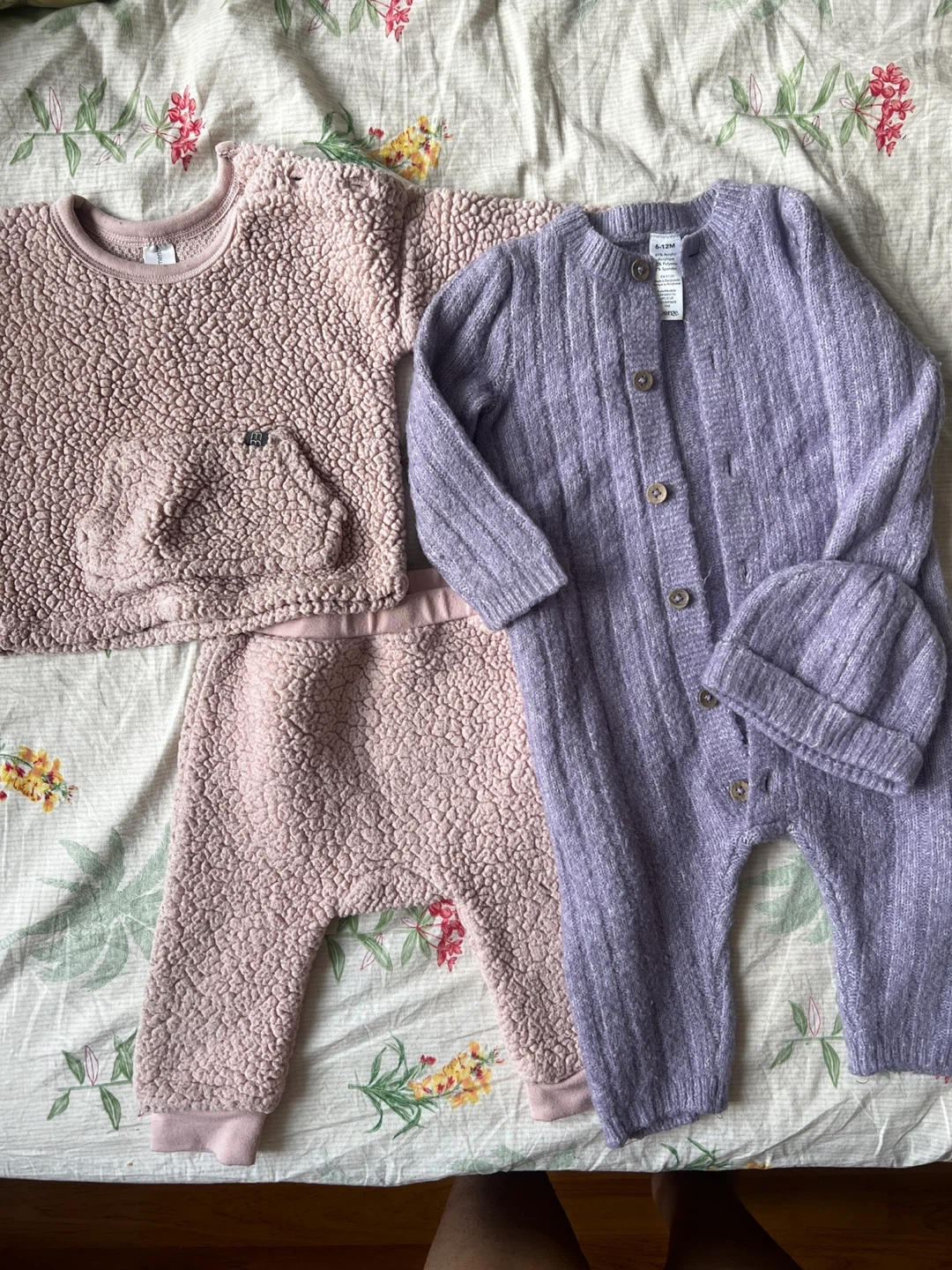 Selling two adorable baby clothing sets. One is a soft pink sherpa-like material with a sweater and pants. The other is a lovely purple knit onesie with a matching hat. Perfect for keeping your little one cozy and stylish!