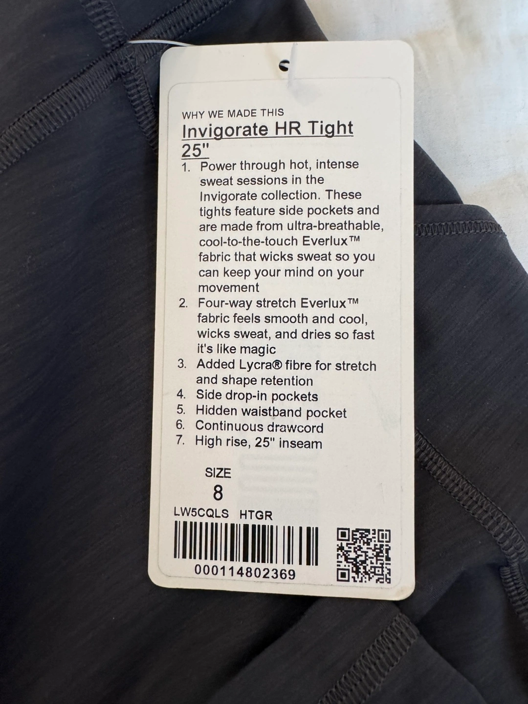 Selling a pair of Lululemon Invigorate HR Tights in a heathered gray color. These are a size 8 and have a 25" inseam. They are made from Everlux fabric, which is four-way stretch, smooth, and cool to the touch. They also feature side drop-in pockets and a hidden waistband pocket for convenience. Added Lycra fibre for stretch and shape retention