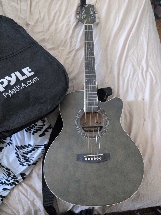 Selling my used Pyle acoustic guitar, perfect for beginners or anyone looking for a budget-friendly instrument. It's in good condition and ready to play. This guitar features a cutaway design for easy access to higher frets and a smooth fretboard. Specifications:
