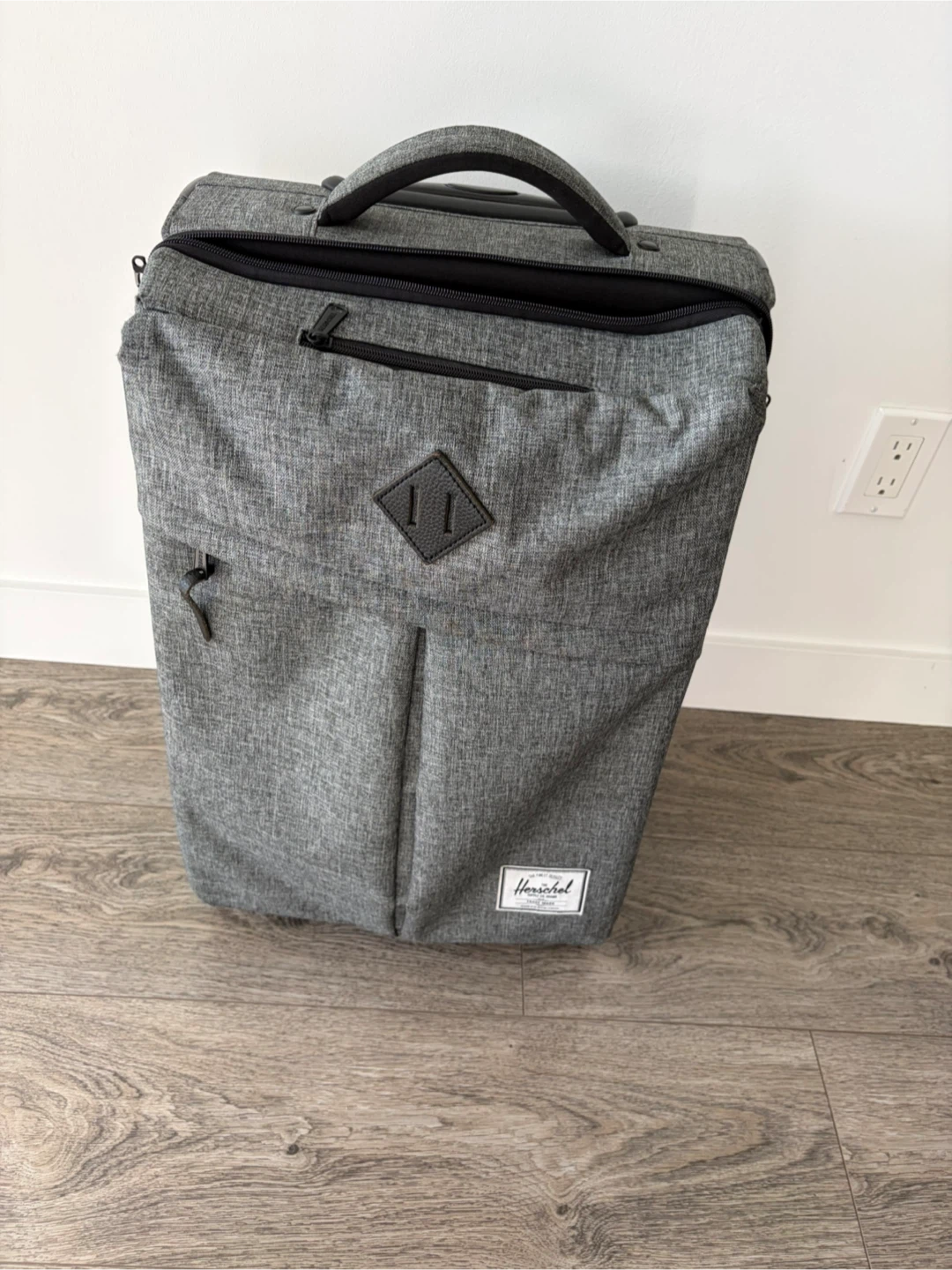 Sleek Herschel roller bag in gray, perfect for weekend trips or carry-on travel. Clean, modern look with durable fabric, smooth inline wheels, and a sturdy telescoping handle. Spacious main compartment with internal mesh pocket and compression straps to keep gear secure. Exterior zip pocket for quick-access essentials. Light scuffs from normal use, no tears or odors.