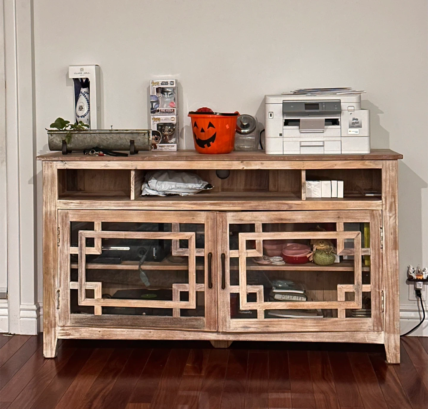 Selling a wooden TV stand or console. It has a beautiful, unique design on the doors and plenty of storage space for your media devices and accessories. It's in good condition and ready to enhance your living room!