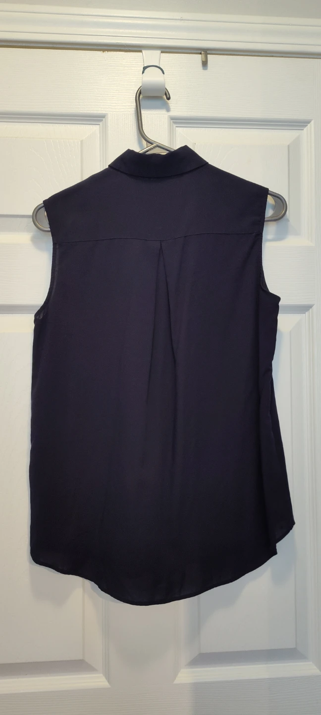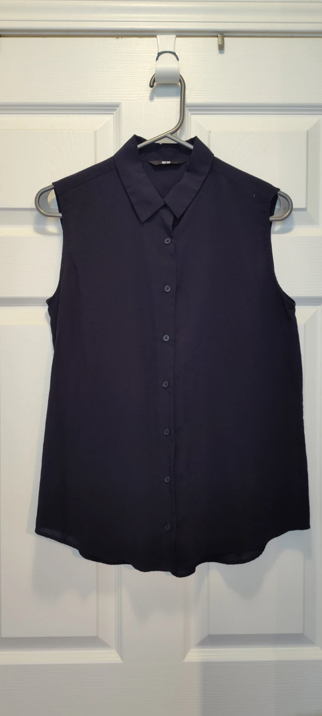 Selling a Uniqlo sleeveless blouse in dark blue! It's in great condition and perfect for a casual or work outfit. The material feels nice and light, perfect for warmer weather.