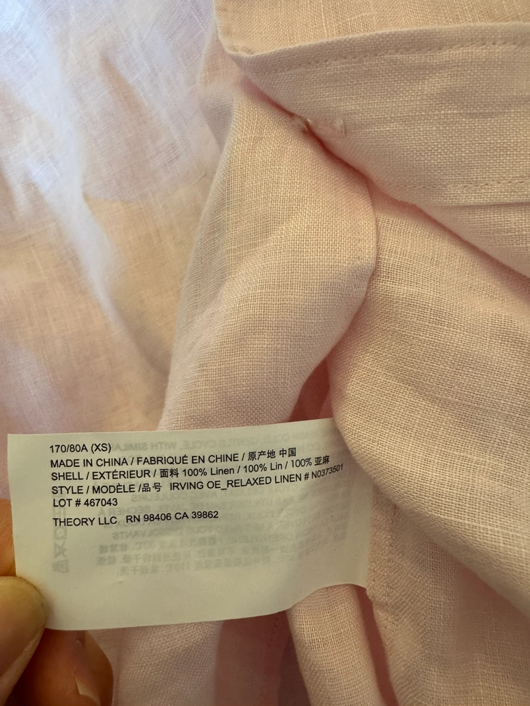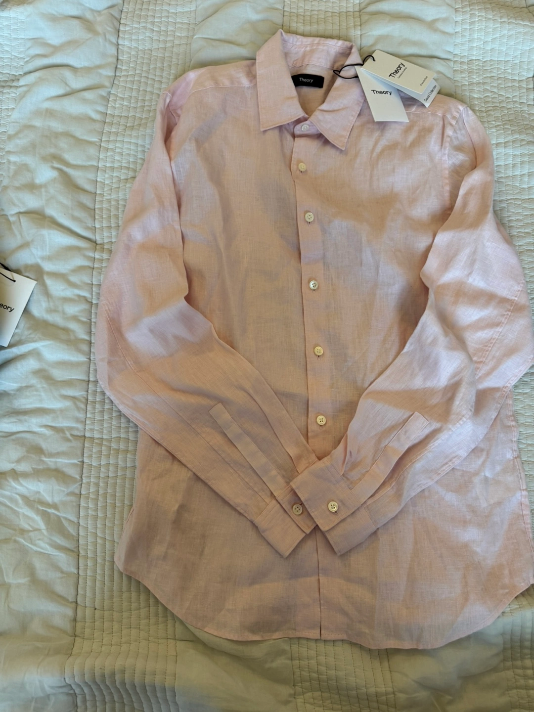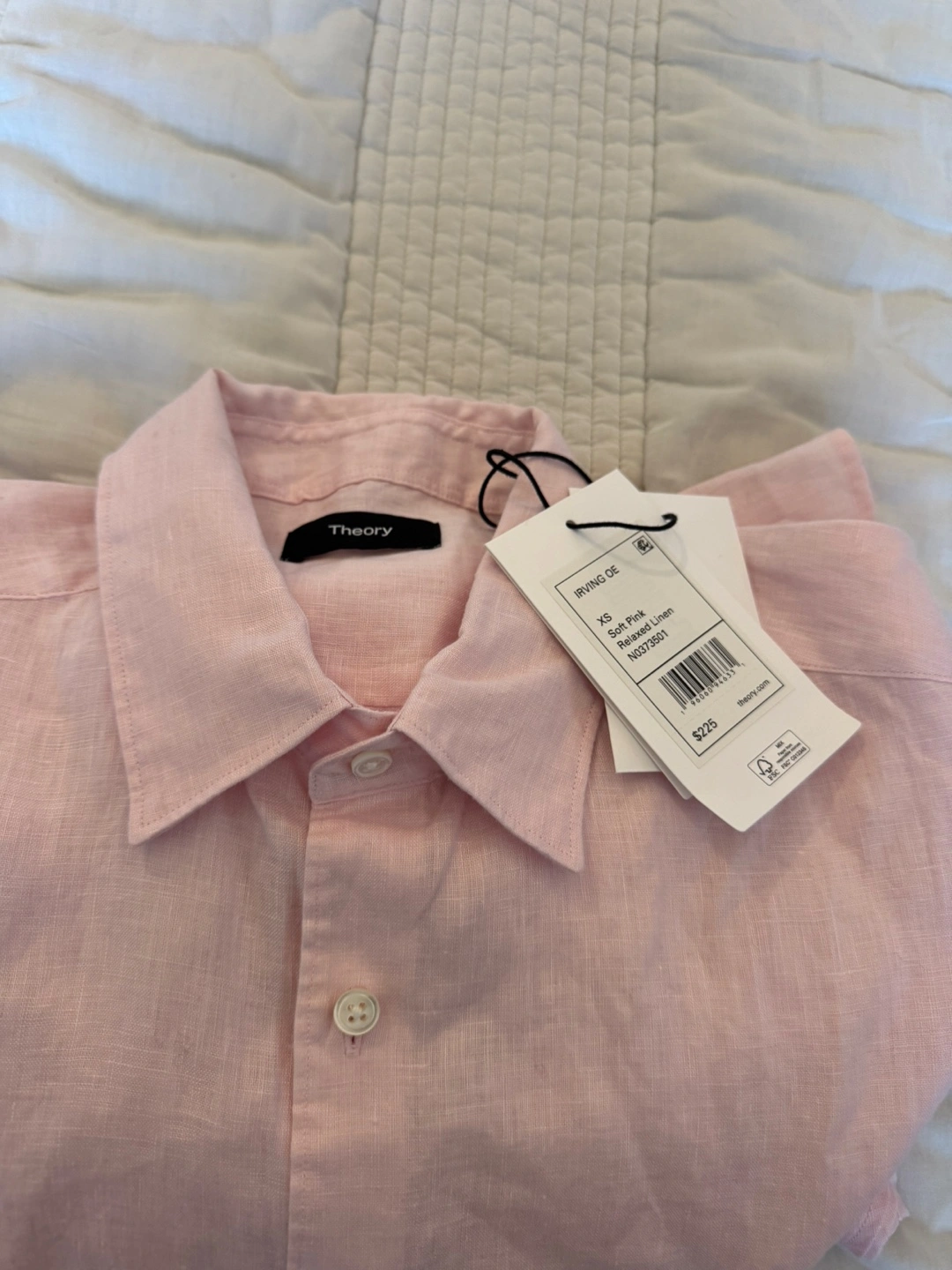 I'm selling a brand new Theory Irving OE Relaxed Linen shirt in size XS! The shirt is made of 100% linen and has a soft pink color. It's a relaxed fit and originally retailed for $225