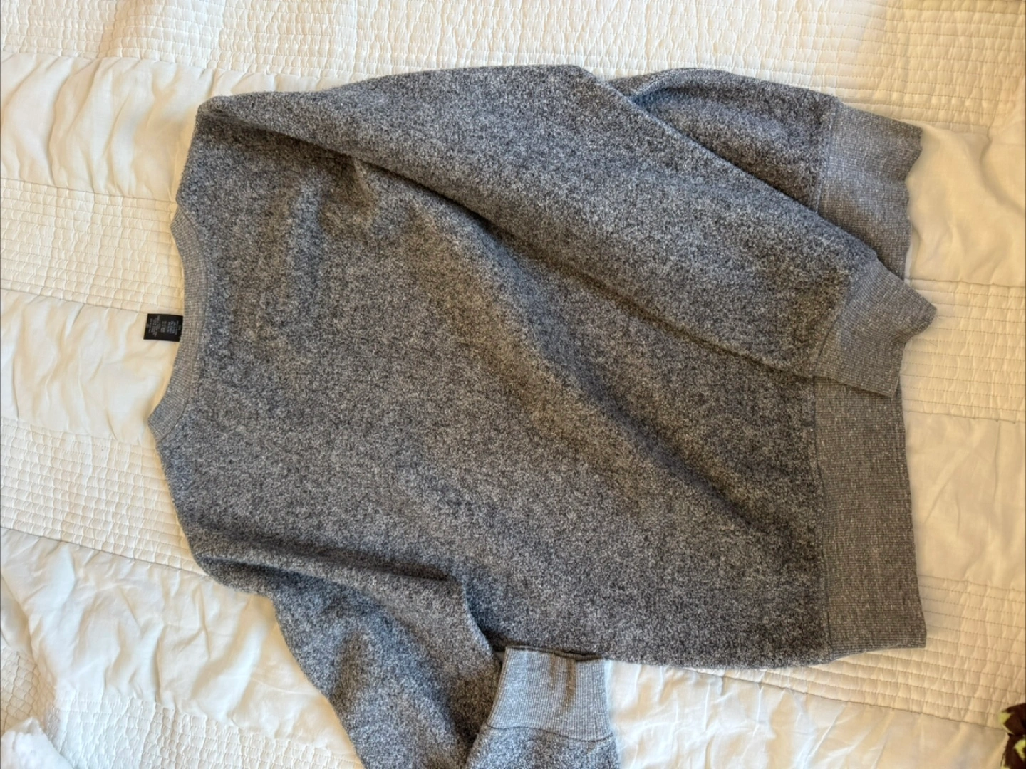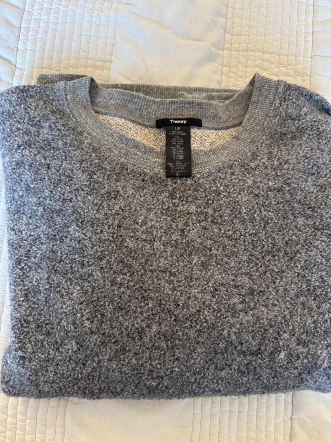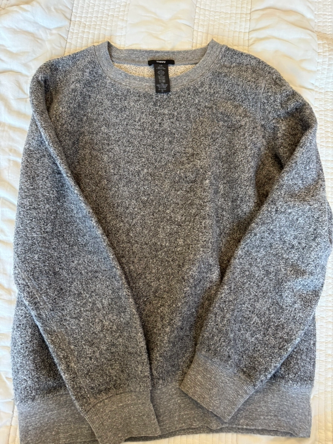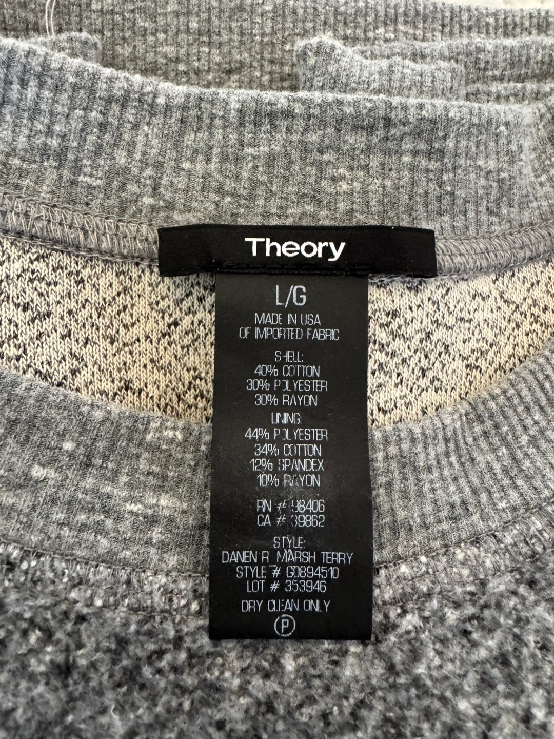 Selling a comfy gray Theory crewneck sweater in size large. It's made of a soft terry material. The shell is 40% cotton, 30% polyester, and 30% rayon. The lining is 44% polyester, 34% cotton, 12% spandex, and 10% rayon.