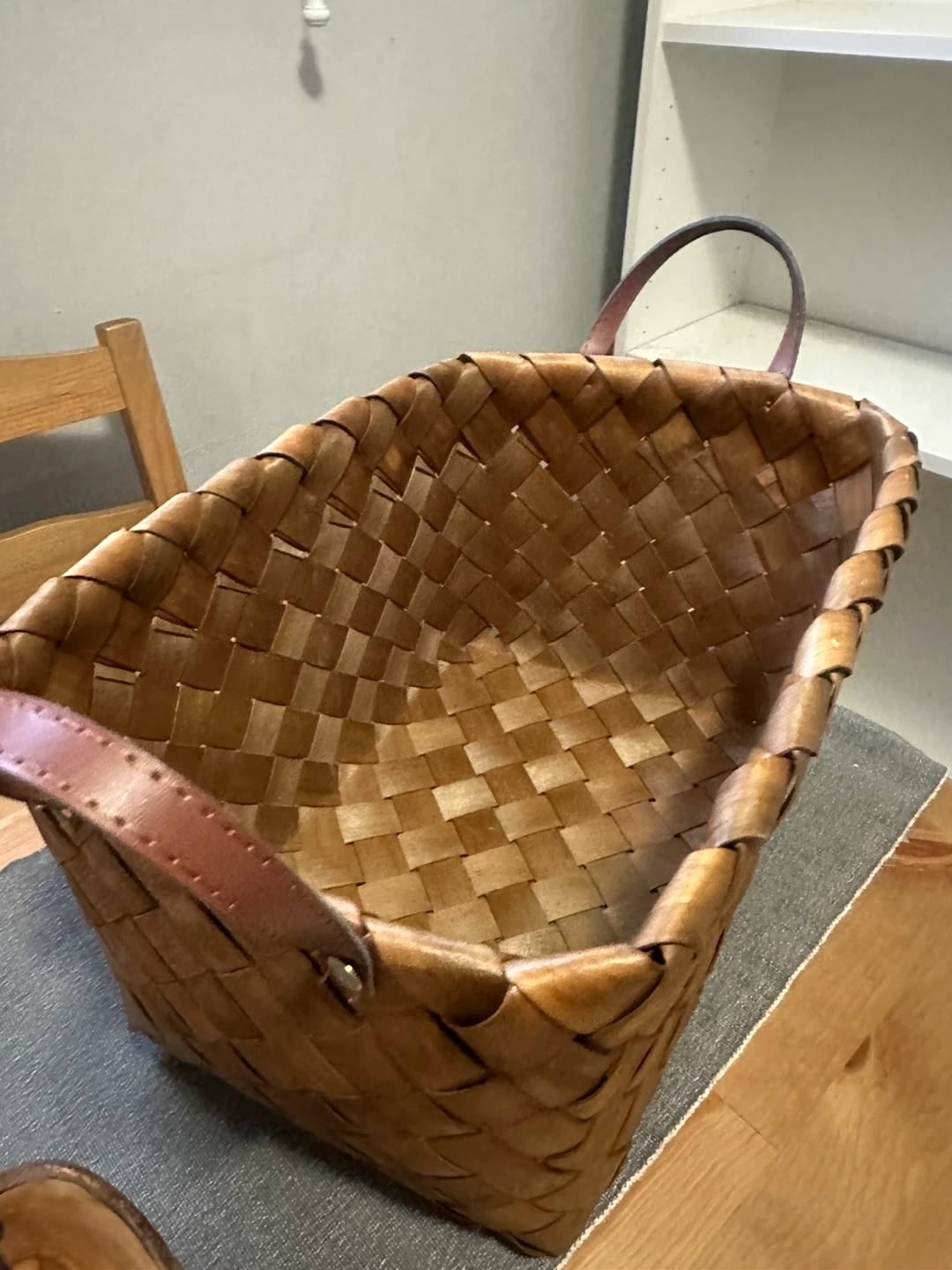 Selling a lovely woven basket with leather handles. It's in great shape and would be perfect for storage or decor in your home