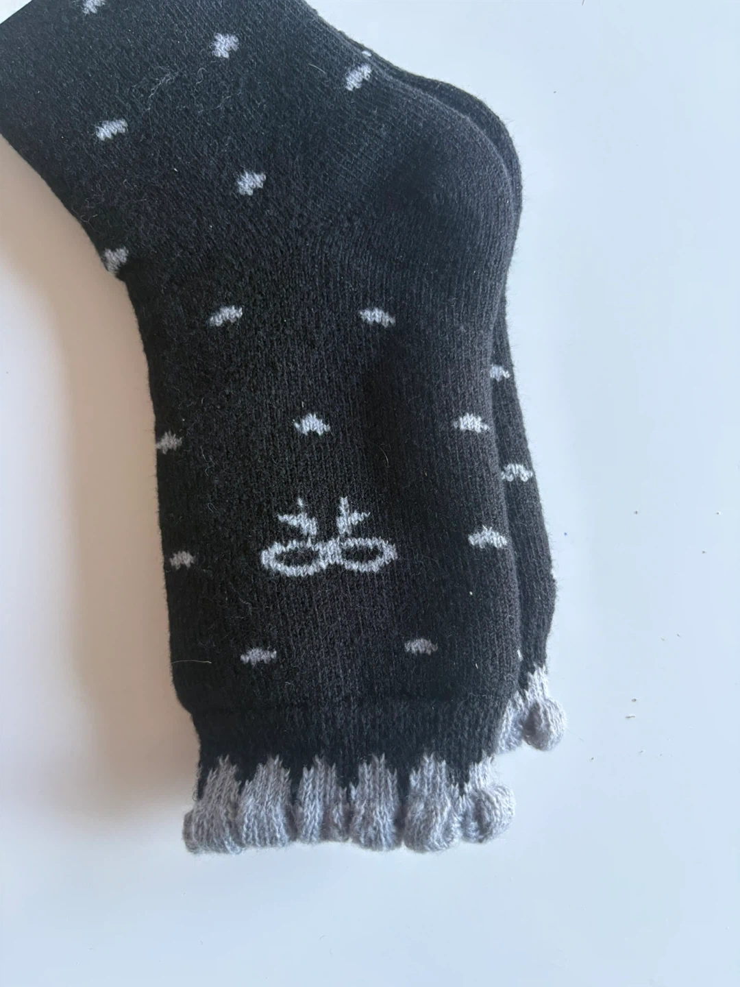 Keep your feet cozy with these Coco&Haha Alpaca thermo socks! They're black with white polka dots and a grey ruffled trim. Size 36-41.