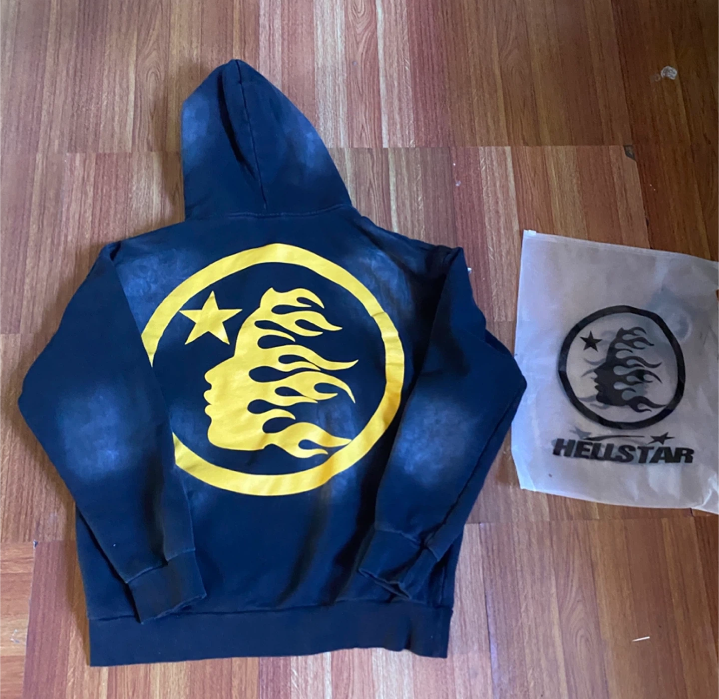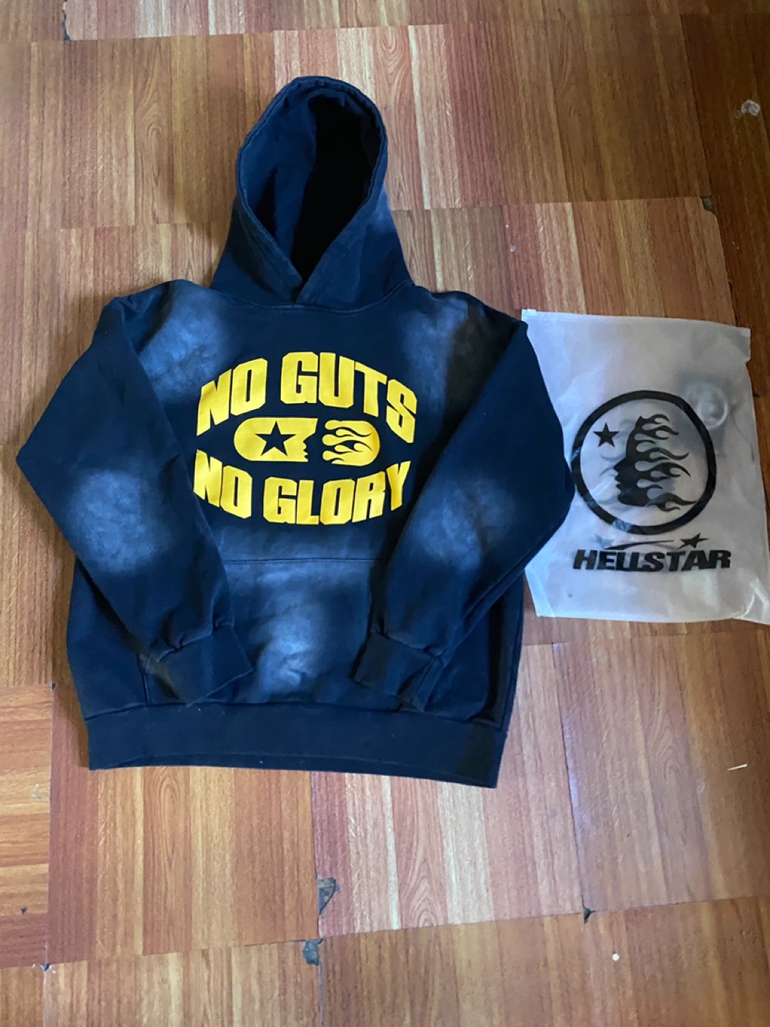 Selling a Hellstar hoodie with the "No Guts No Glory" design! It's a size small and comes with its original packaging. The hoodie is in great condition and ready for a new owner!
