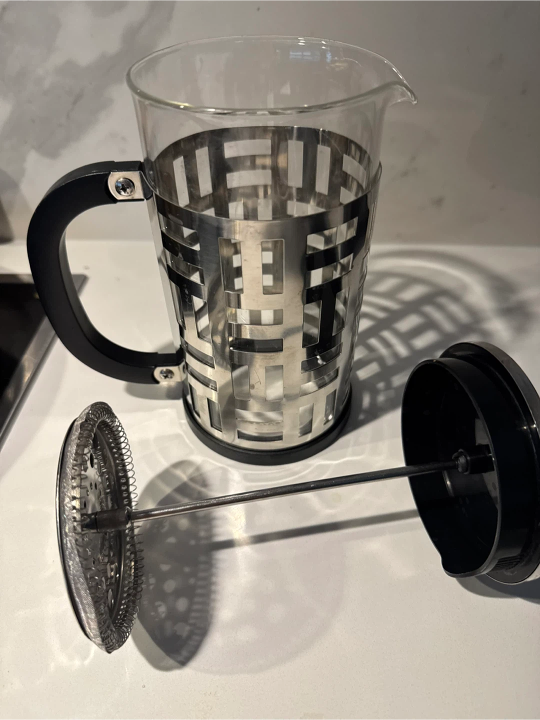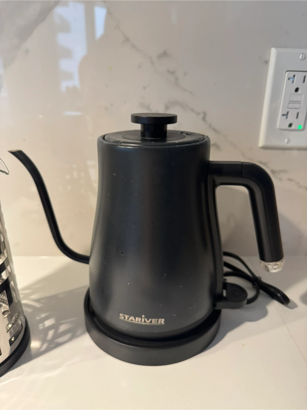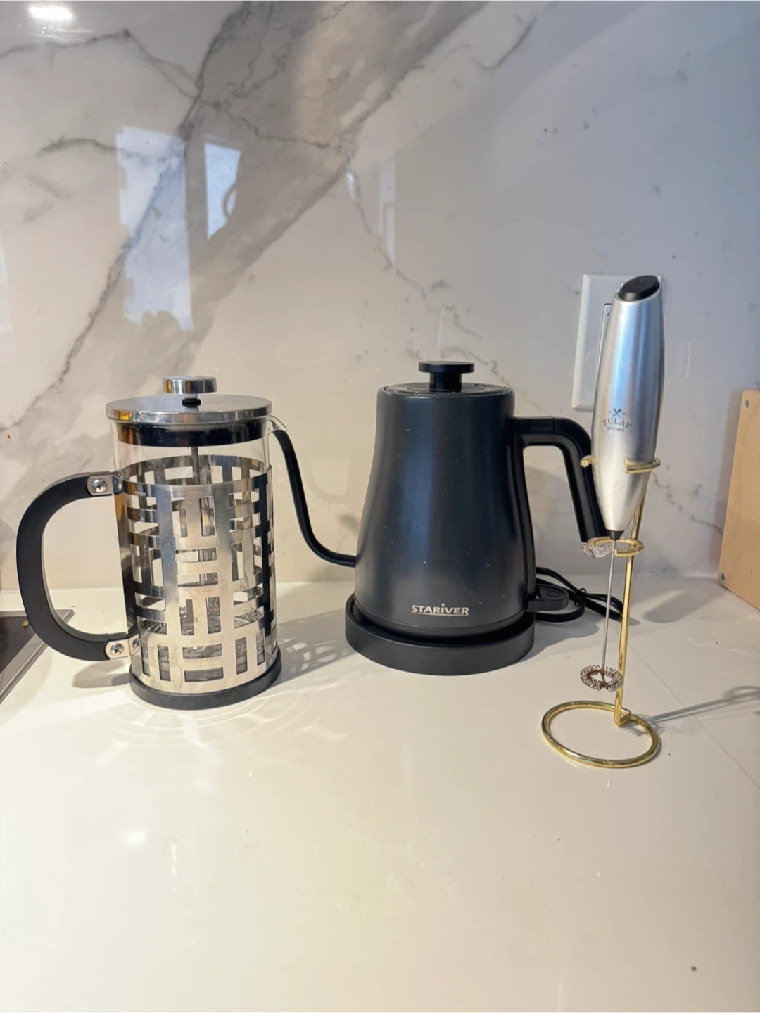 Selling a coffee making bundle, includes a Starriver electric gooseneck kettle in black, a Zulay milk frother with a stand, and a 1 lt french press. All of them in excellent condition and ready to use