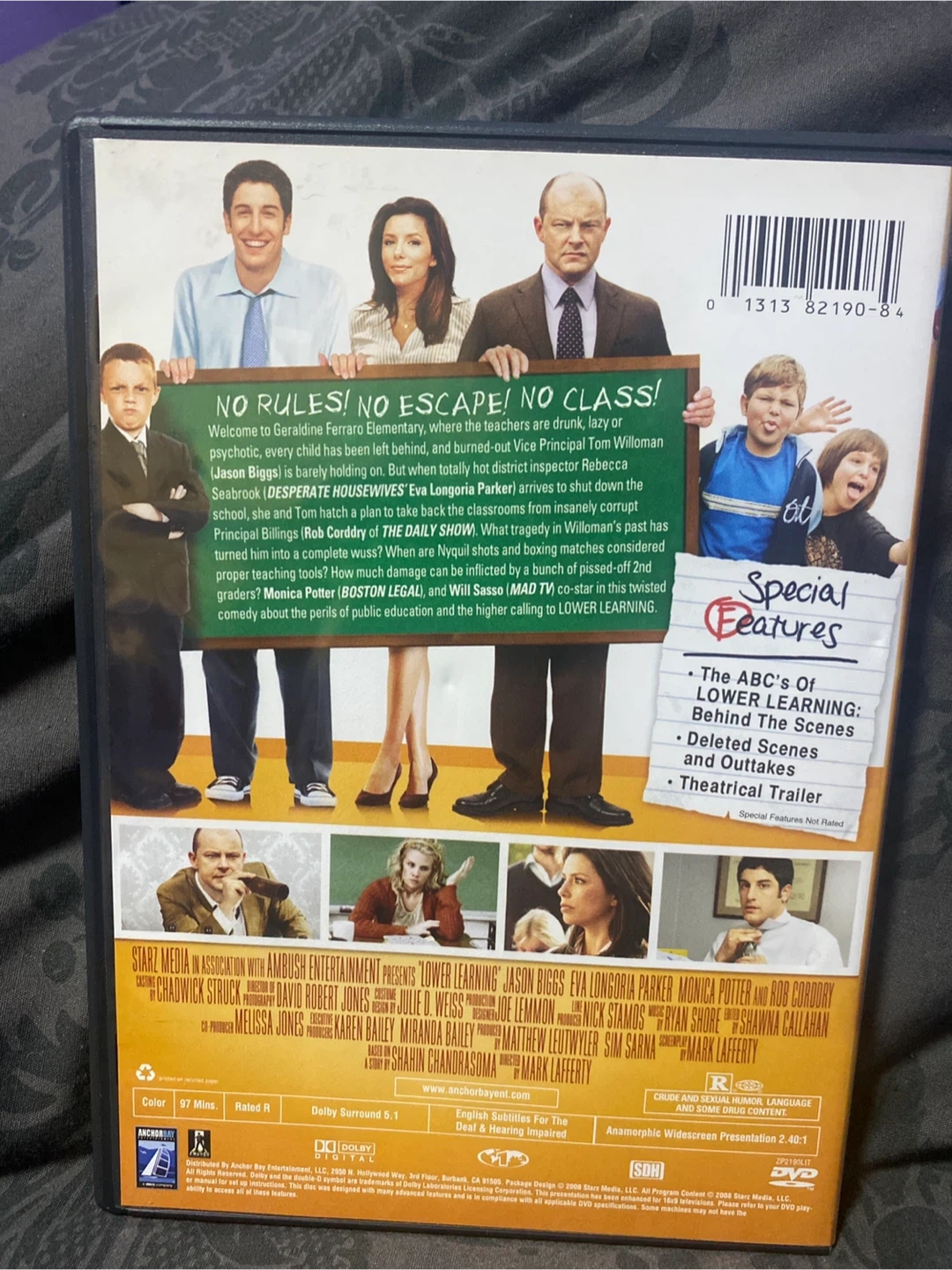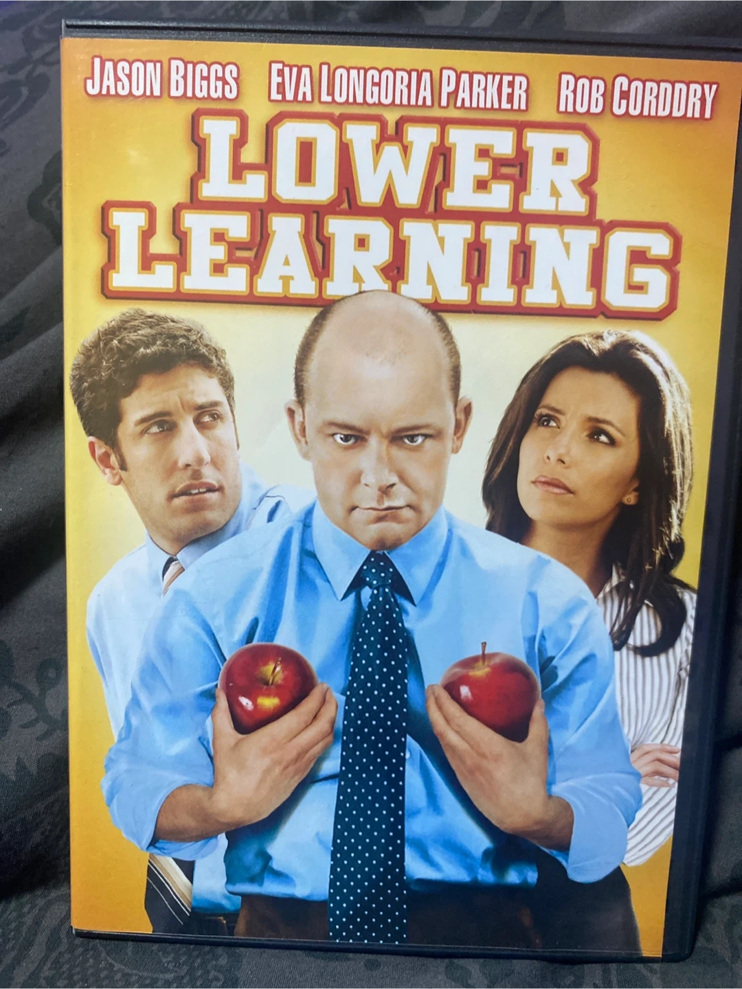 Selling a DVD of the movie Lower Learning starring Jason Biggs, Eva Longoria Parker, and Rob Corddry. It's a comedy about the perils of public education. Rated R, 97 minutes