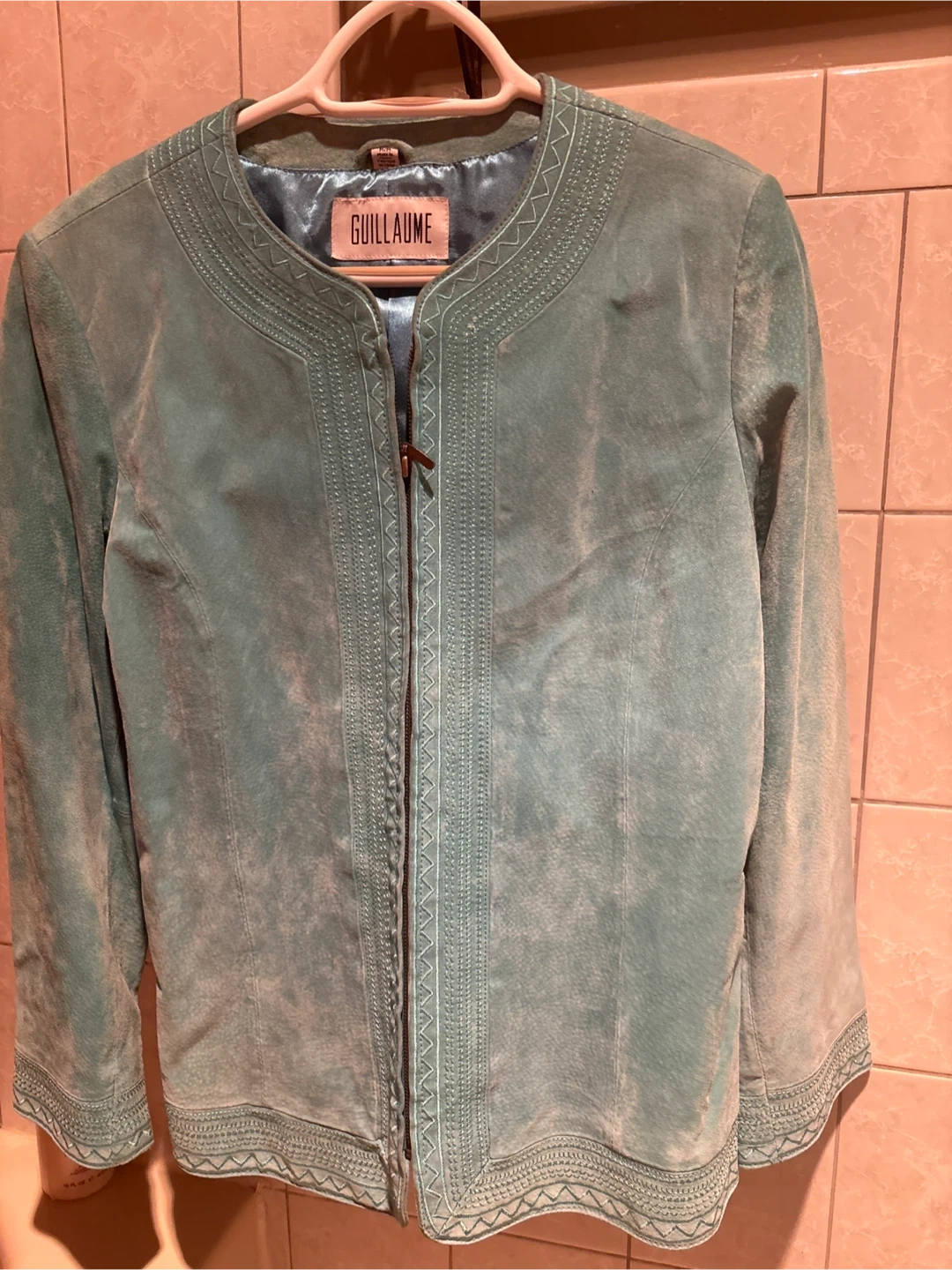 Here's a beautiful Guillaume jacket made of suede. It has a unique turquoise colour that's sure to stand out. It's in great condition and ready for a new home!