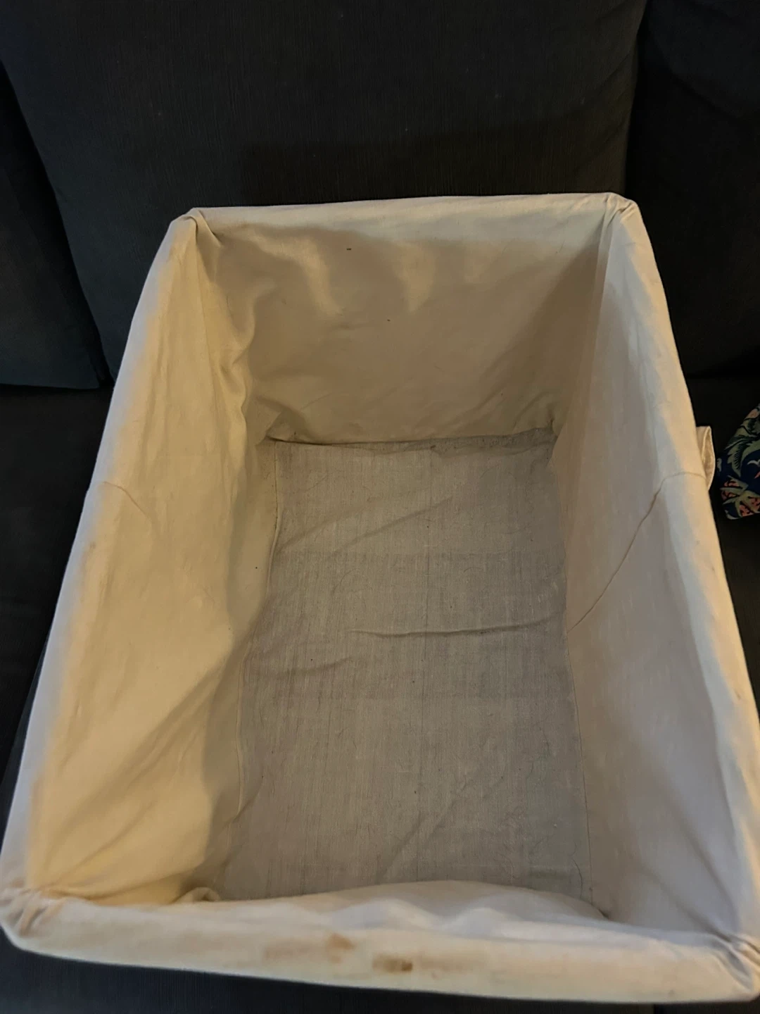 Selling a wicker basket, perfect for storage or decor! It comes with a cloth liner inside. It is in good condition.