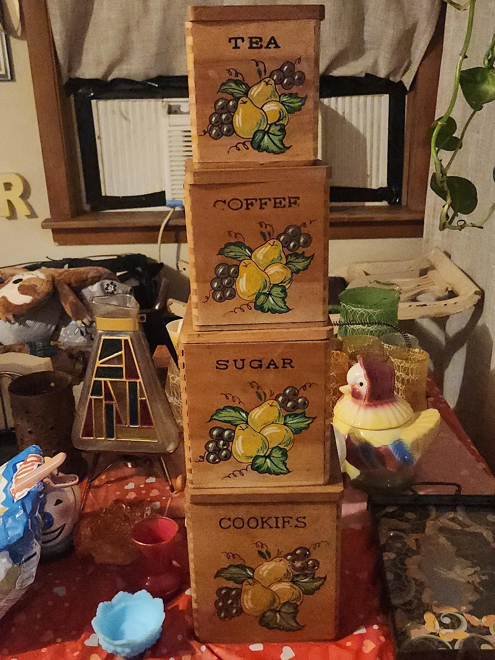 I have a set of four vintage wooden kitchen canisters for sale. They are labeled Tea, Coffee, Sugar, and Cookies, and each has a fruit design on the front. They would make a great addition to any kitchen!