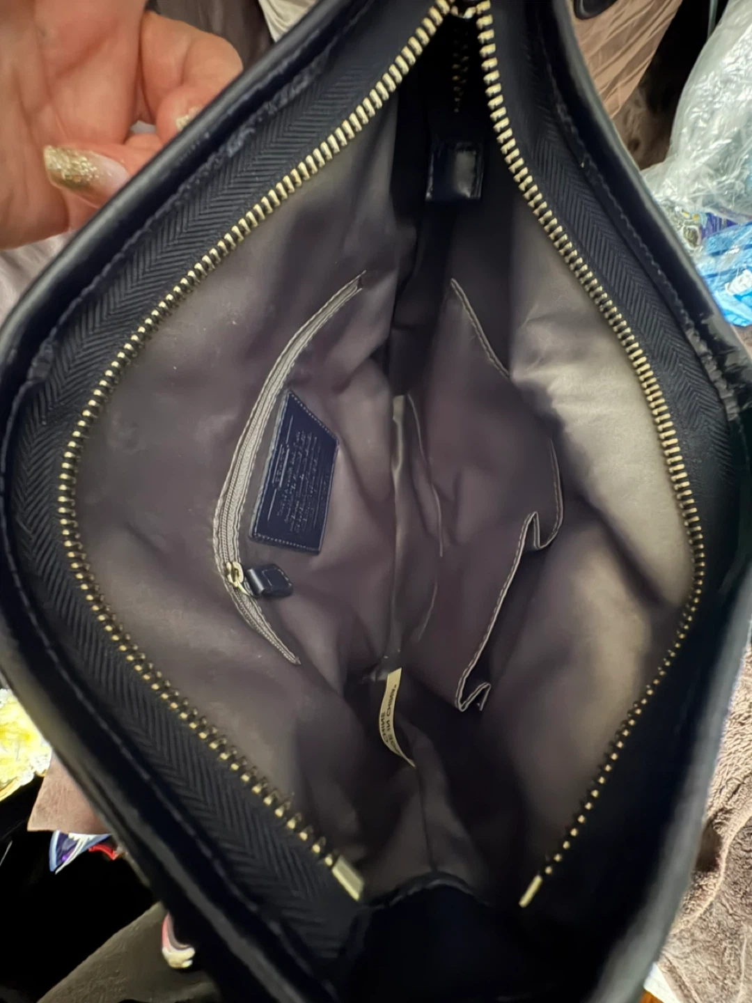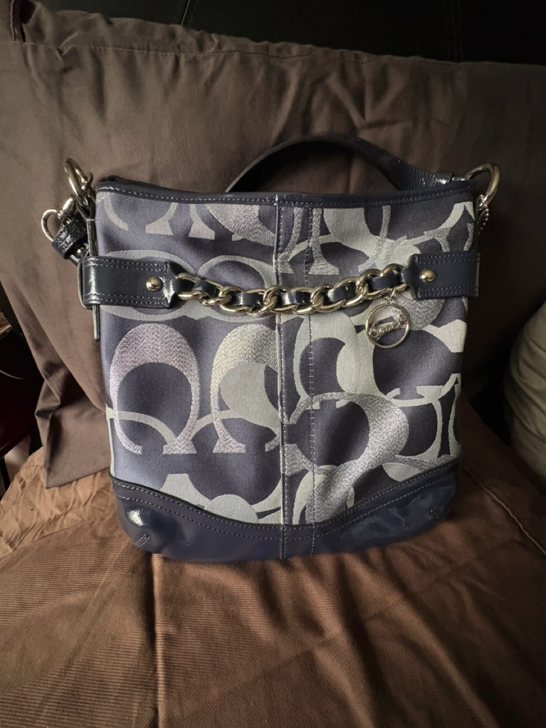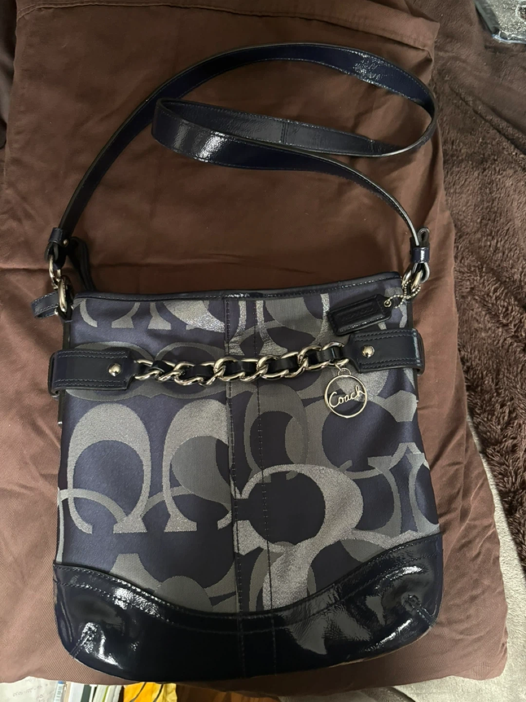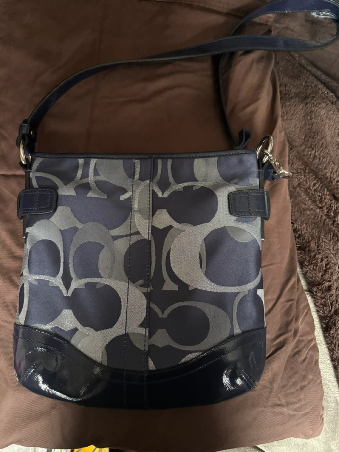 Selling a Coach crossbody bag in excellent condition! It features a stylish design with the Coach logo pattern and navy blue accents. It's perfect for everyday use and keeping your essentials organized,very spacious secure zipper closure, small scratch on the patent leather on the bottom.