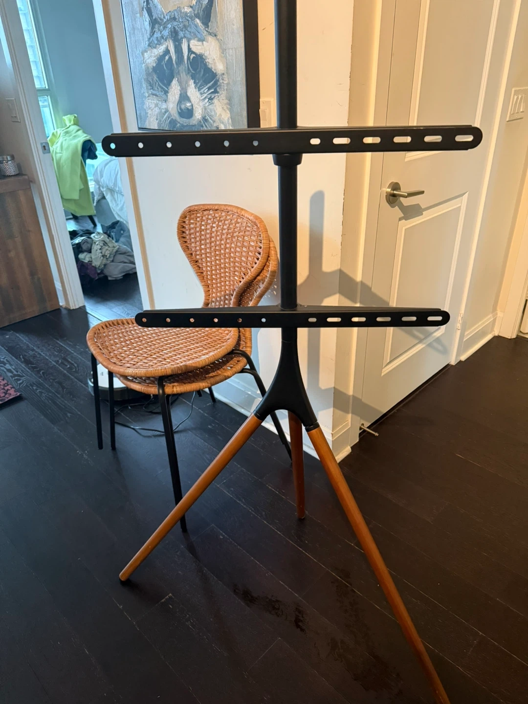 Selling a modern TV stand featuring a sleek black frame and stylish wooden legs. It's in great condition and ready to hold your TV! Fits 45" to 65" TV's: This easel TV stand is designed to fit most 45” to 65” screens on the market with VESA 200x200, 300x200, 300x300, 400x200, 400x300, 400x400, or 600x400mm mounting holes