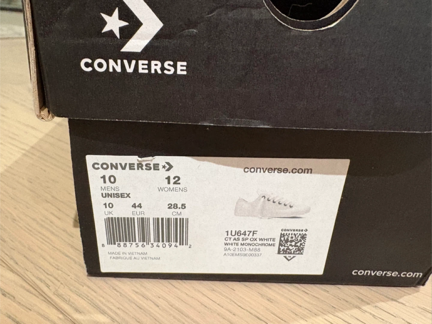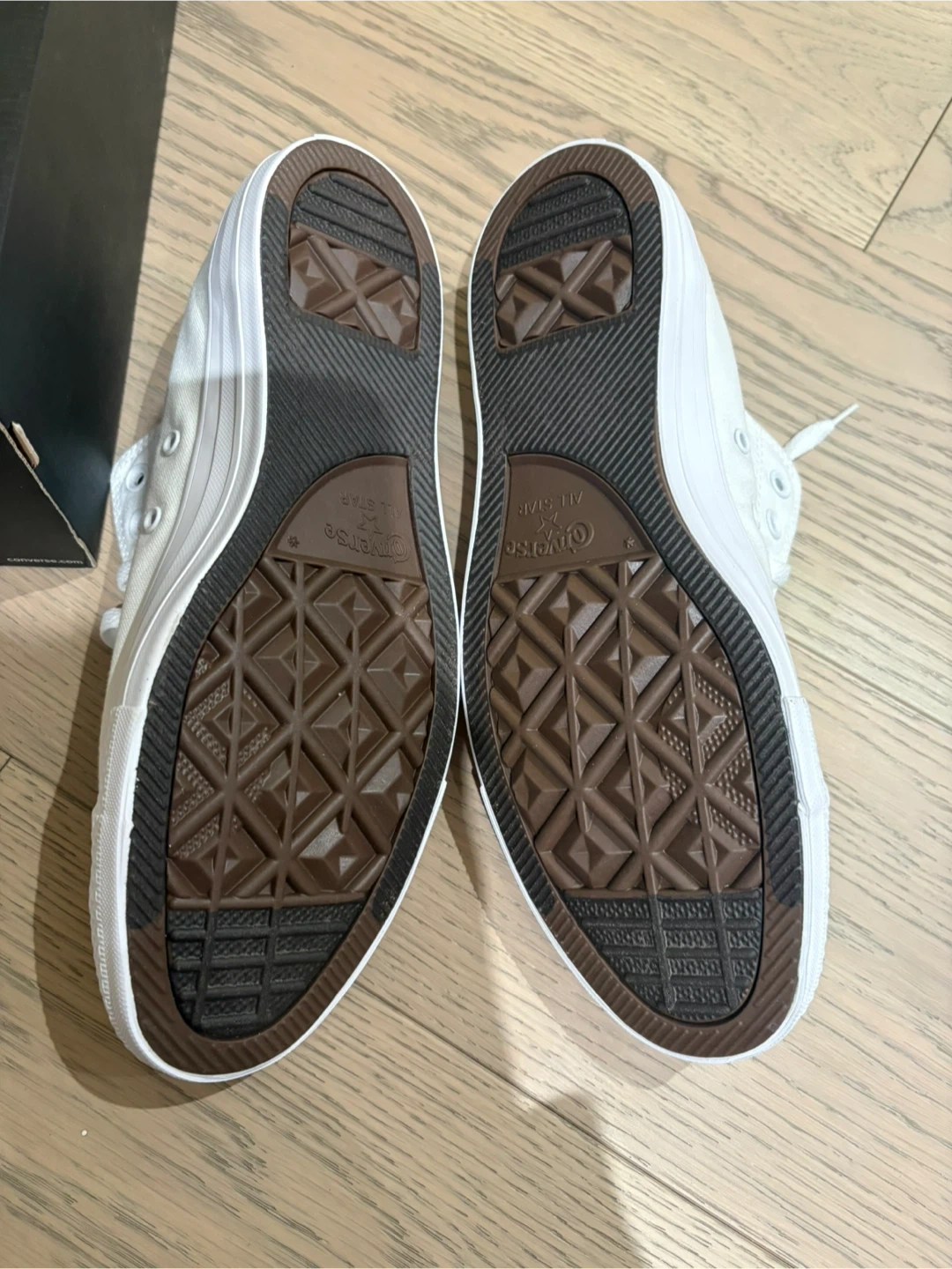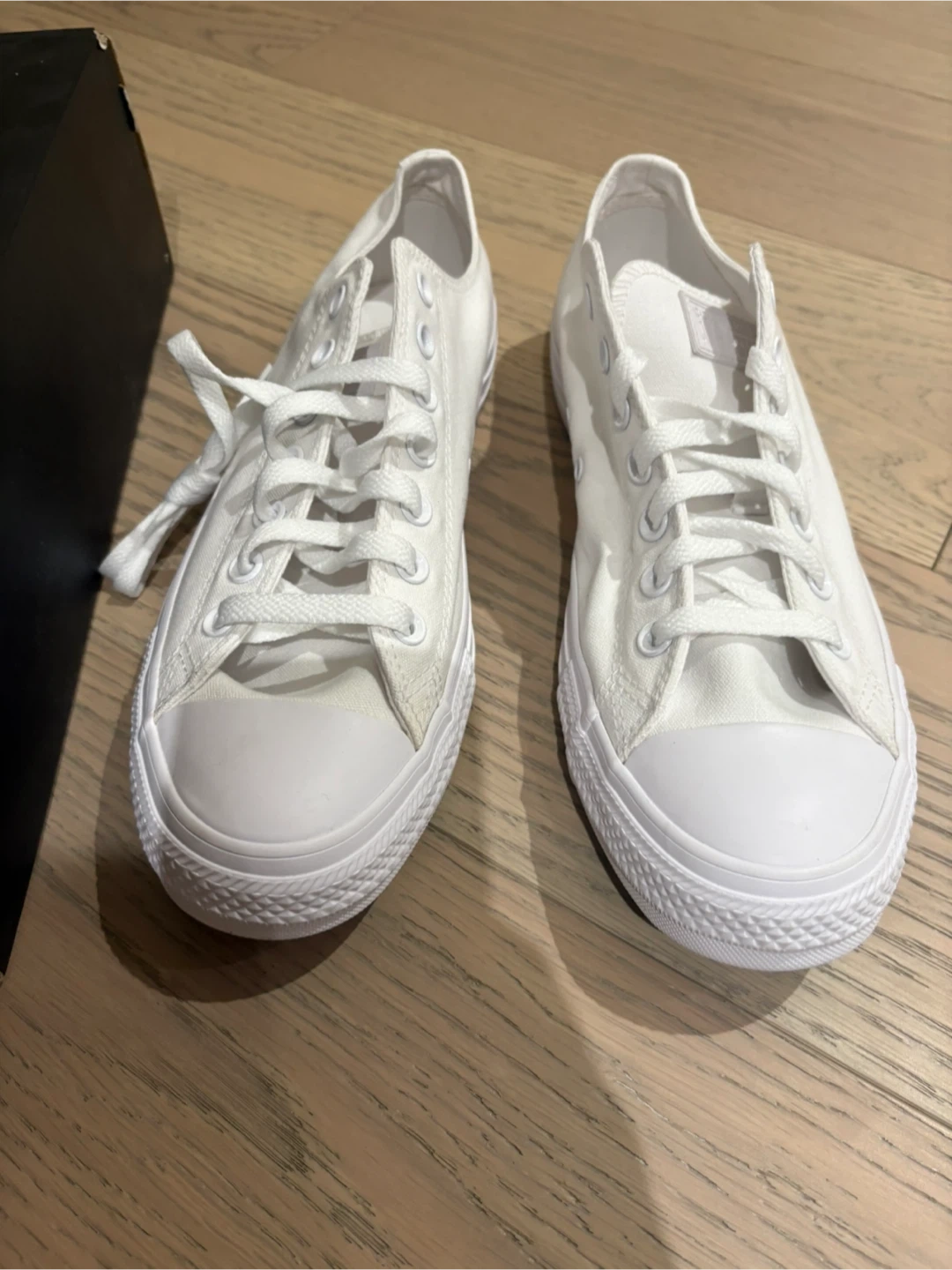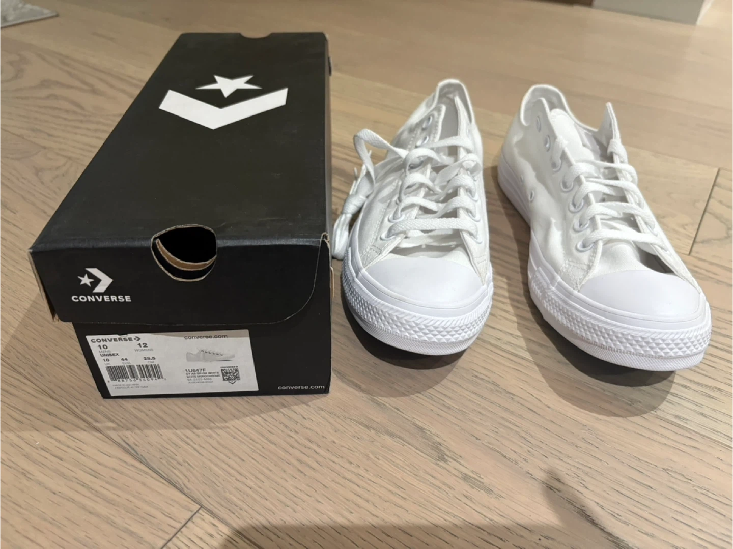 Selling a pair of Converse Chuck Taylor All Star sneakers in white monochrome, size 10! These are a classic style that goes with everything. Brand new in original box.