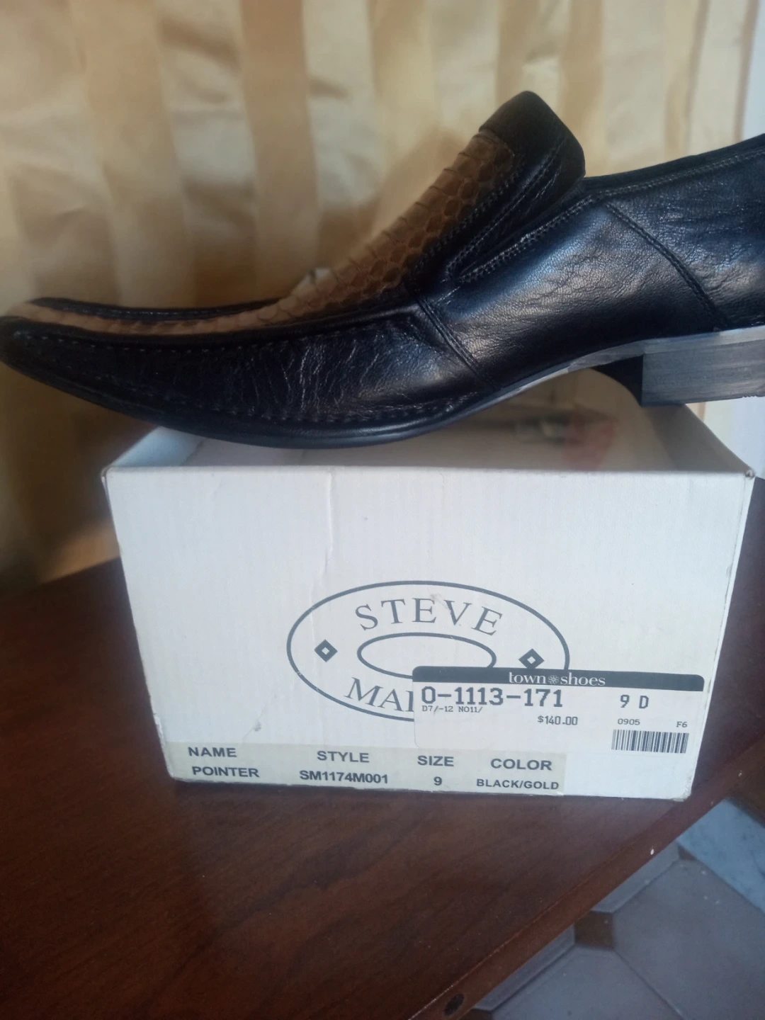 Selling a pair of Steve Madden Pointer loafers in size 9. The shoes are black and gold. They come with the original box. Style number is SM1174M001. Originally bought for $140