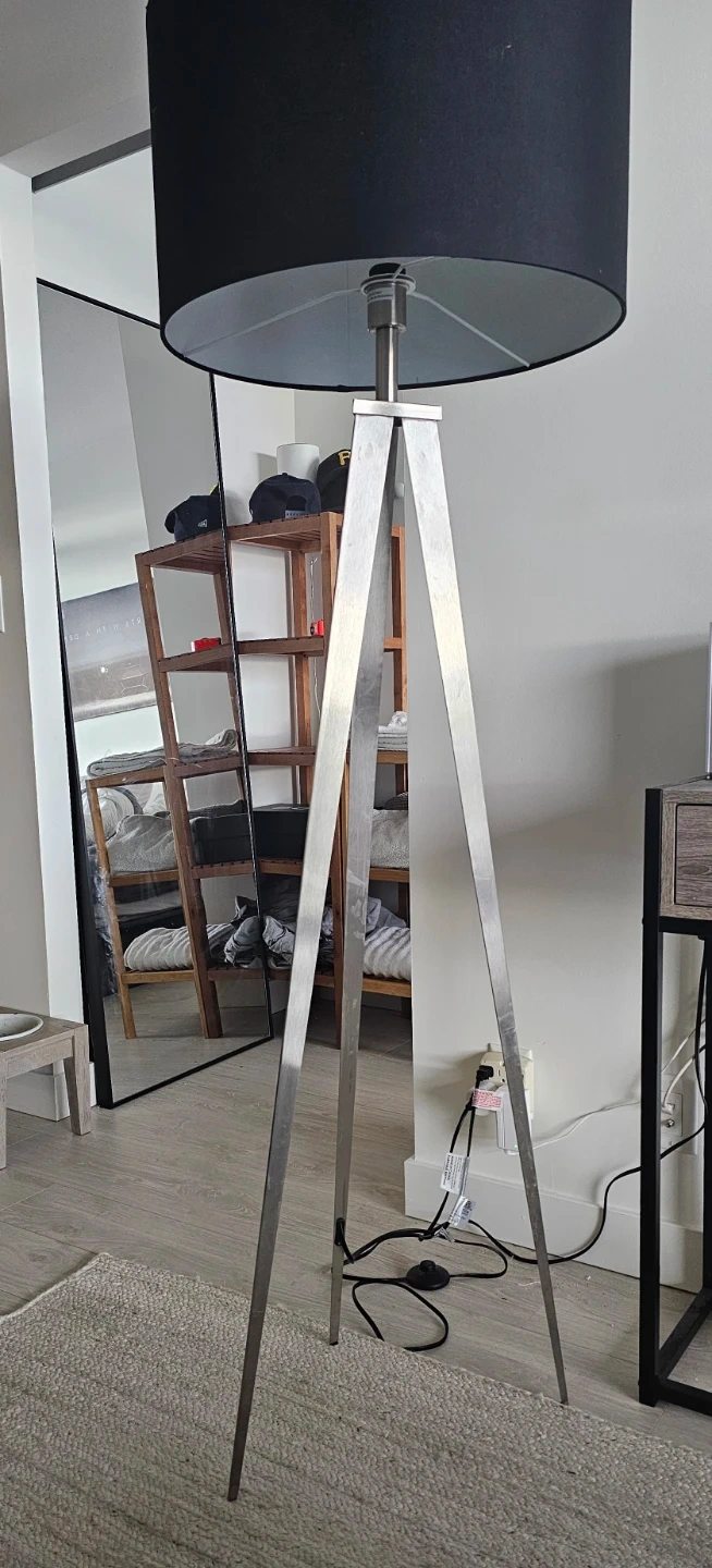 Selling a stylish tripod floor lamp! It features a sleek, modern design with a black lampshade and silver-tone metal legs. It would be a great addition to any living room or bedroom! Bulb included