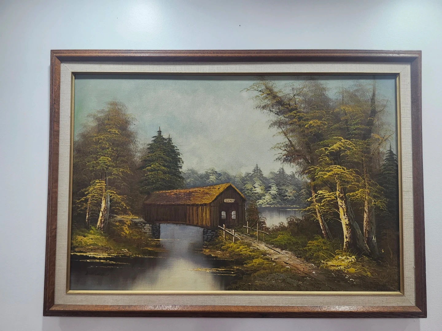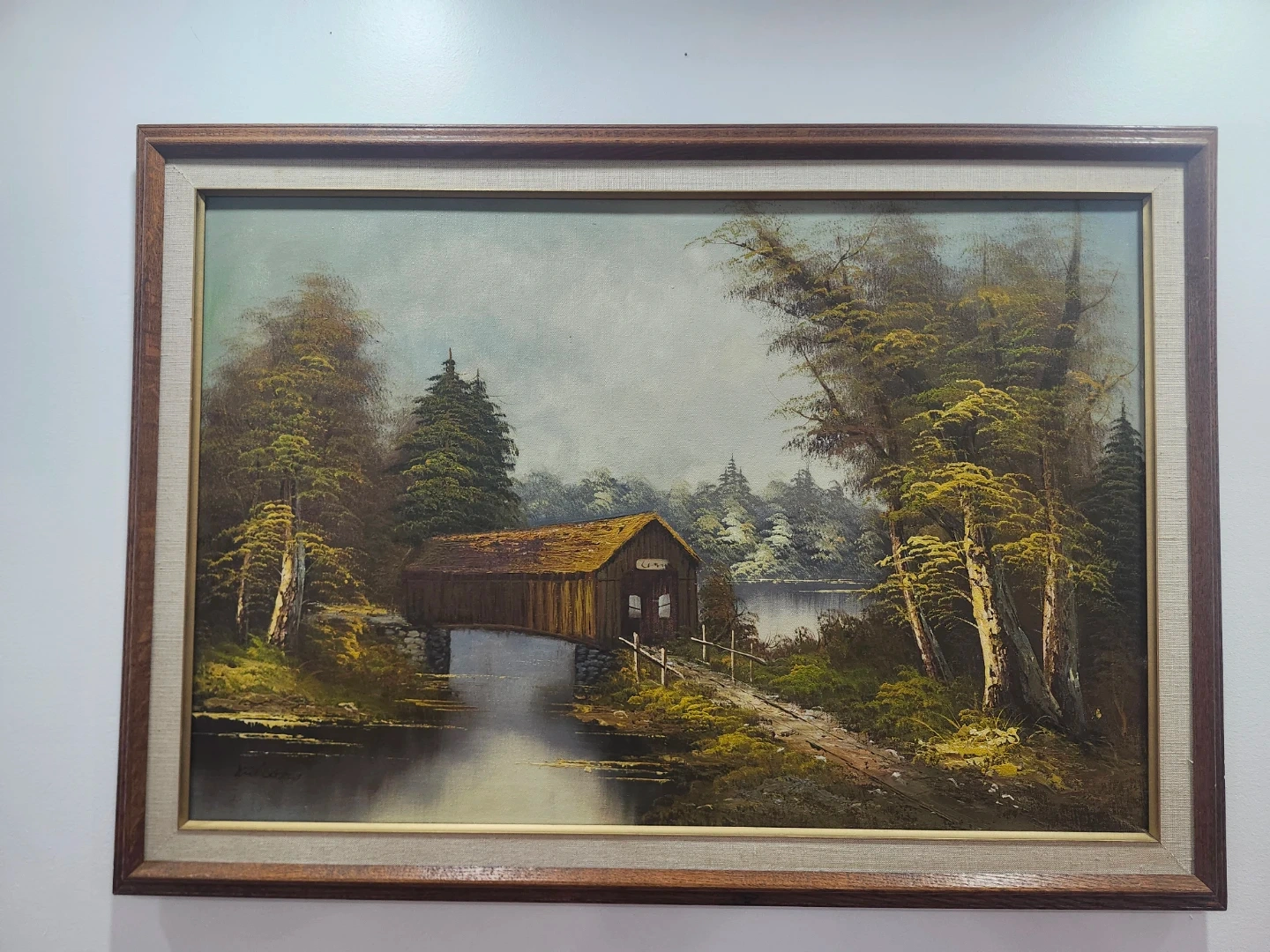 Framed Landscape Painting – Covered Bridge & Forest Scene