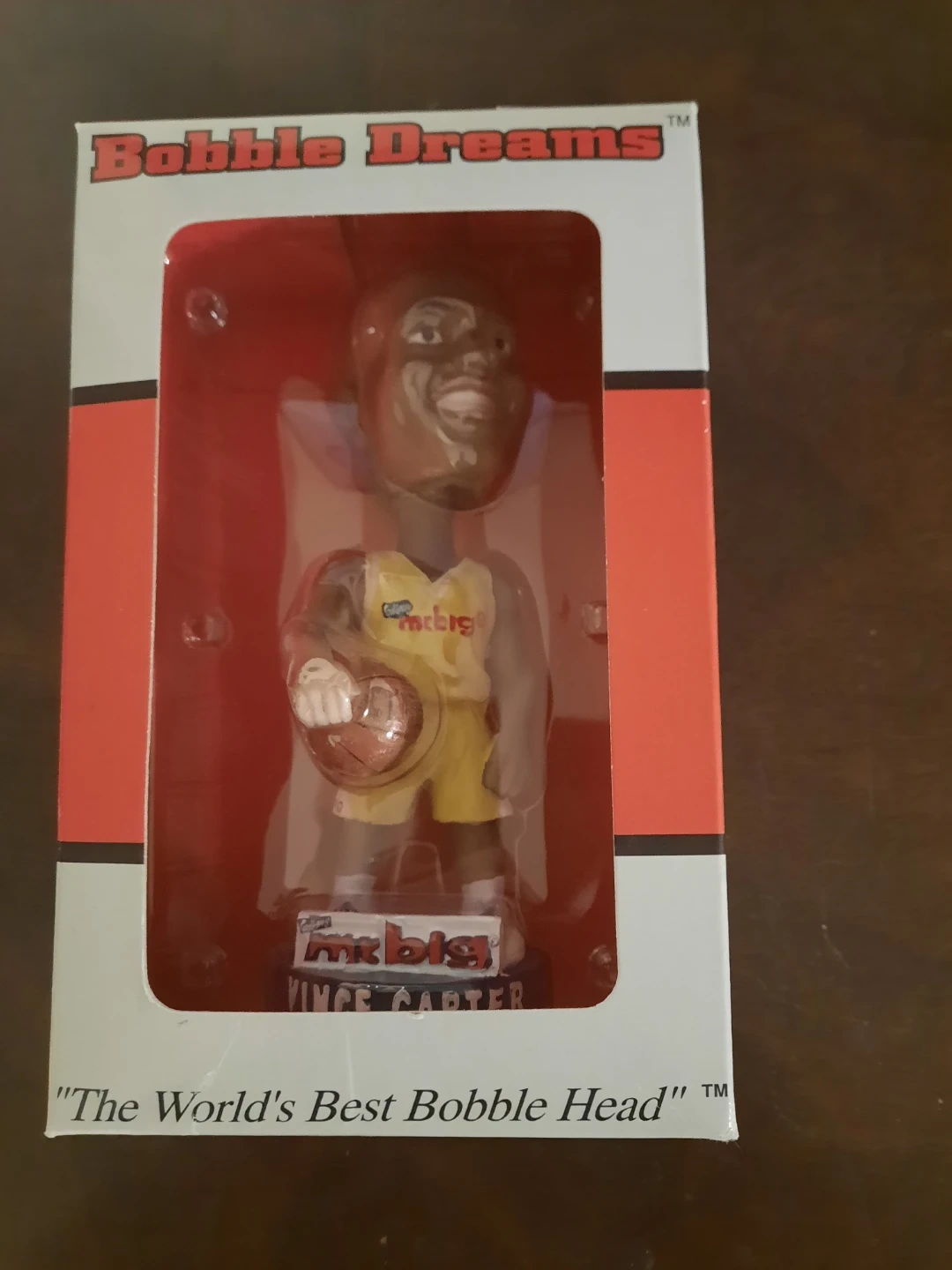 This Bobble Dreams bobblehead features Vince Carter. It's a collectible item with the "mr big" branding on the base. It's housed in its original packaging, making it a great addition for any fan!