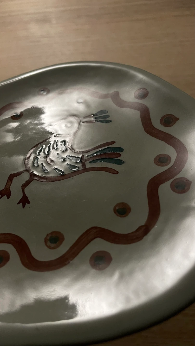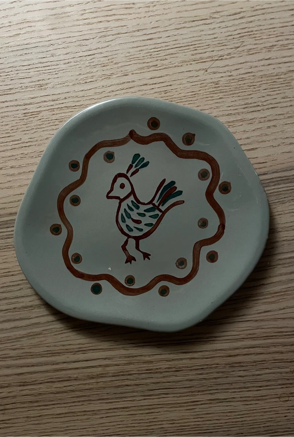 Hand-painted style plate featuring a bird design. Made in India. Beautiful, organic, decorative stoneware piece. Approximately 6 x 5 inches in diameter. Has minor signs of use.