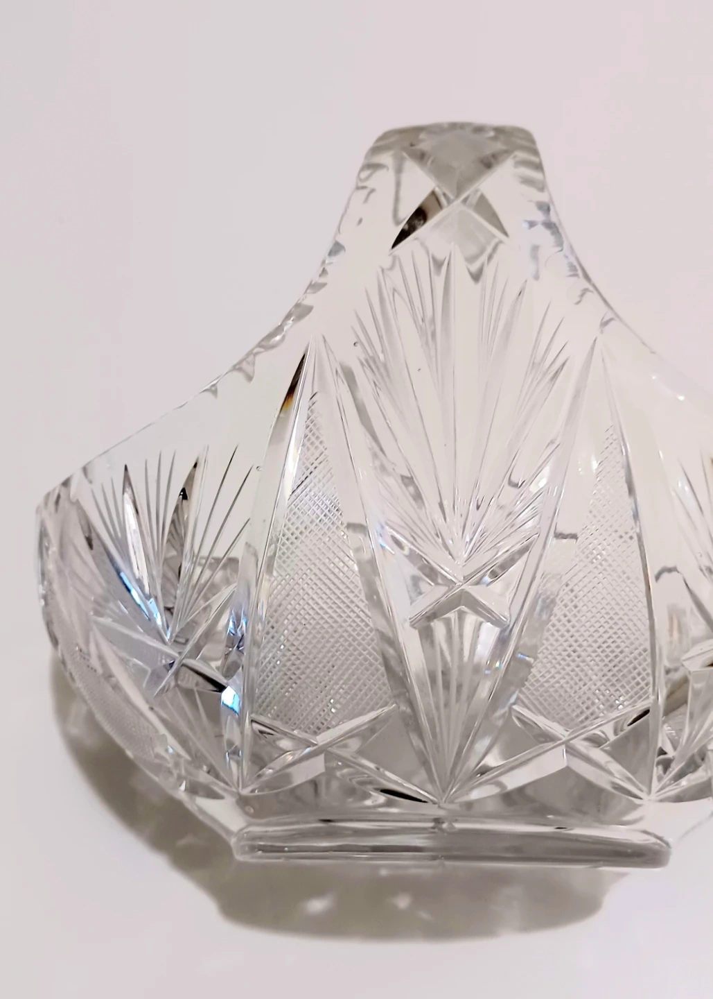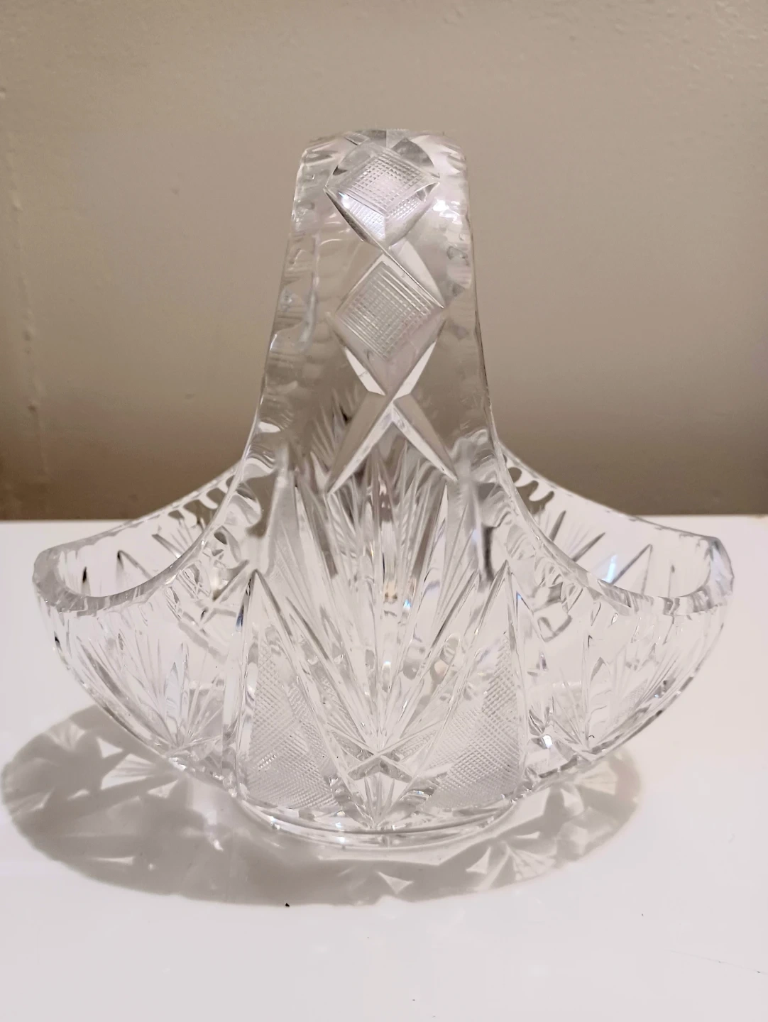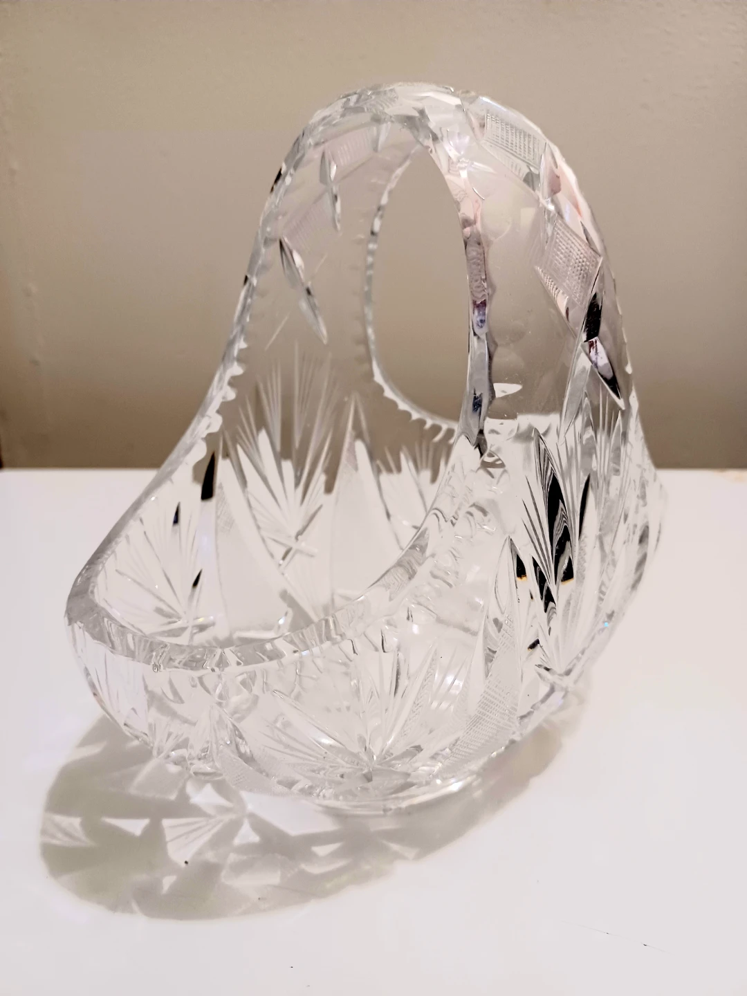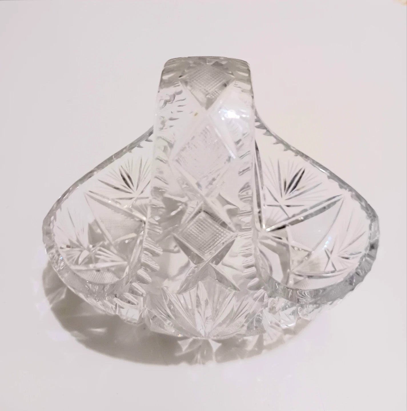 This elegant, crystal basket features intricate detailing and a timeless design, perfect for collectors or as a stunning decorative piece.