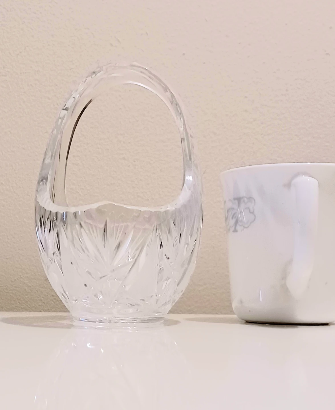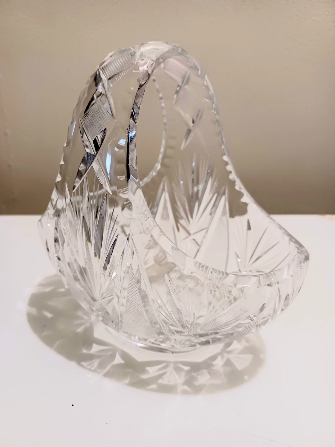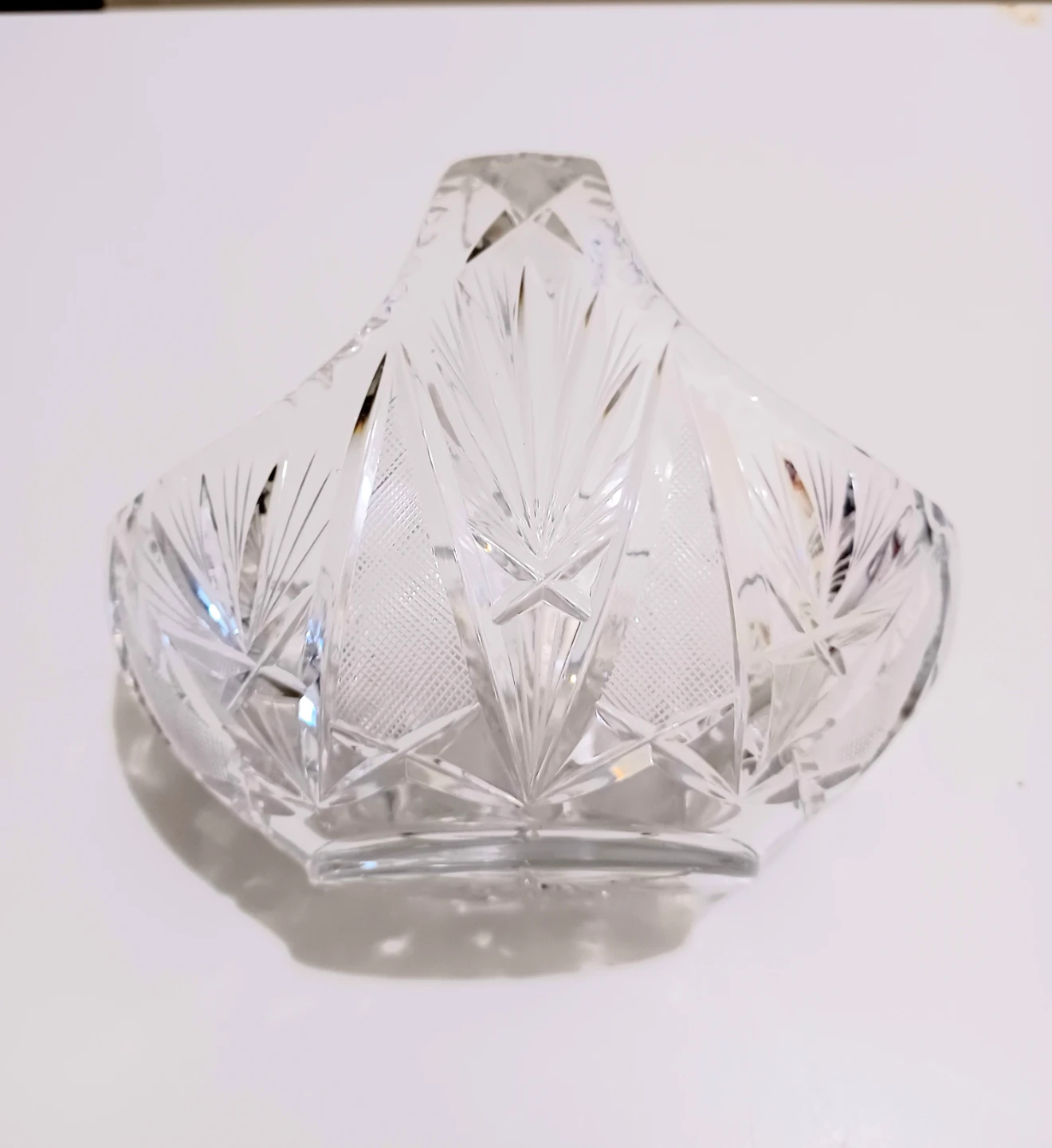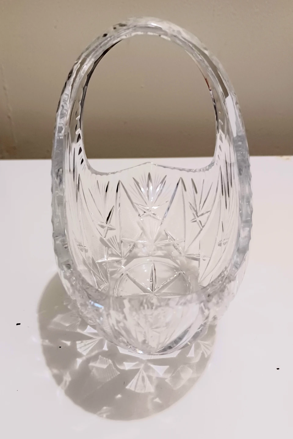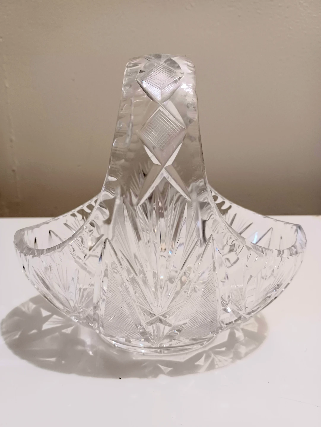 This elegant, crystal basket features intricate detailing and a timeless design, perfect for collectors or as a stunning decorative piece.