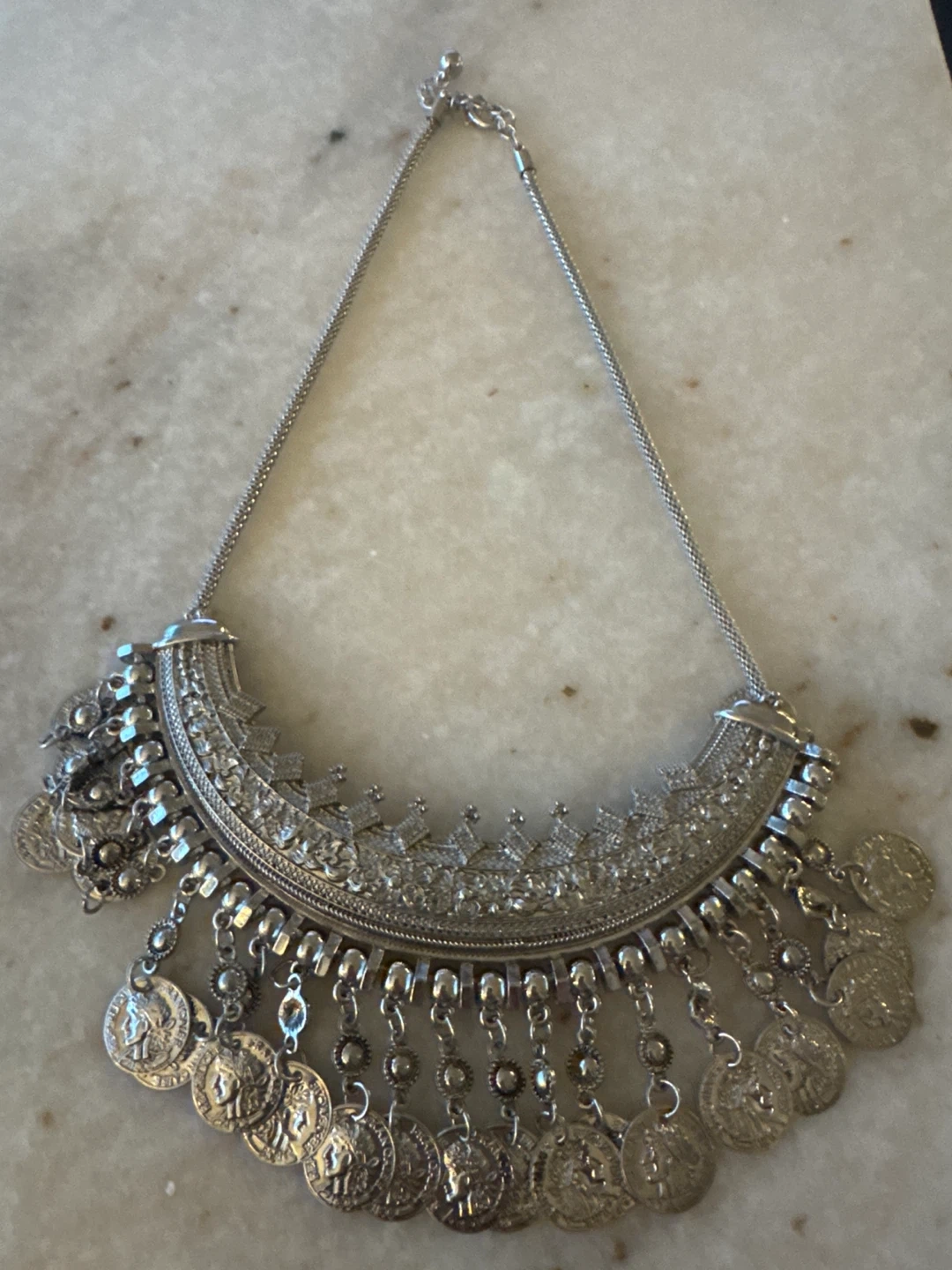 Striking silver-tone statement necklace featuring intricate metalwork and cascading coin fringe details. A bold, bohemian piece with global appeal—perfect for elevating simple outfits or styling for festivals, vacations, or evening looks.