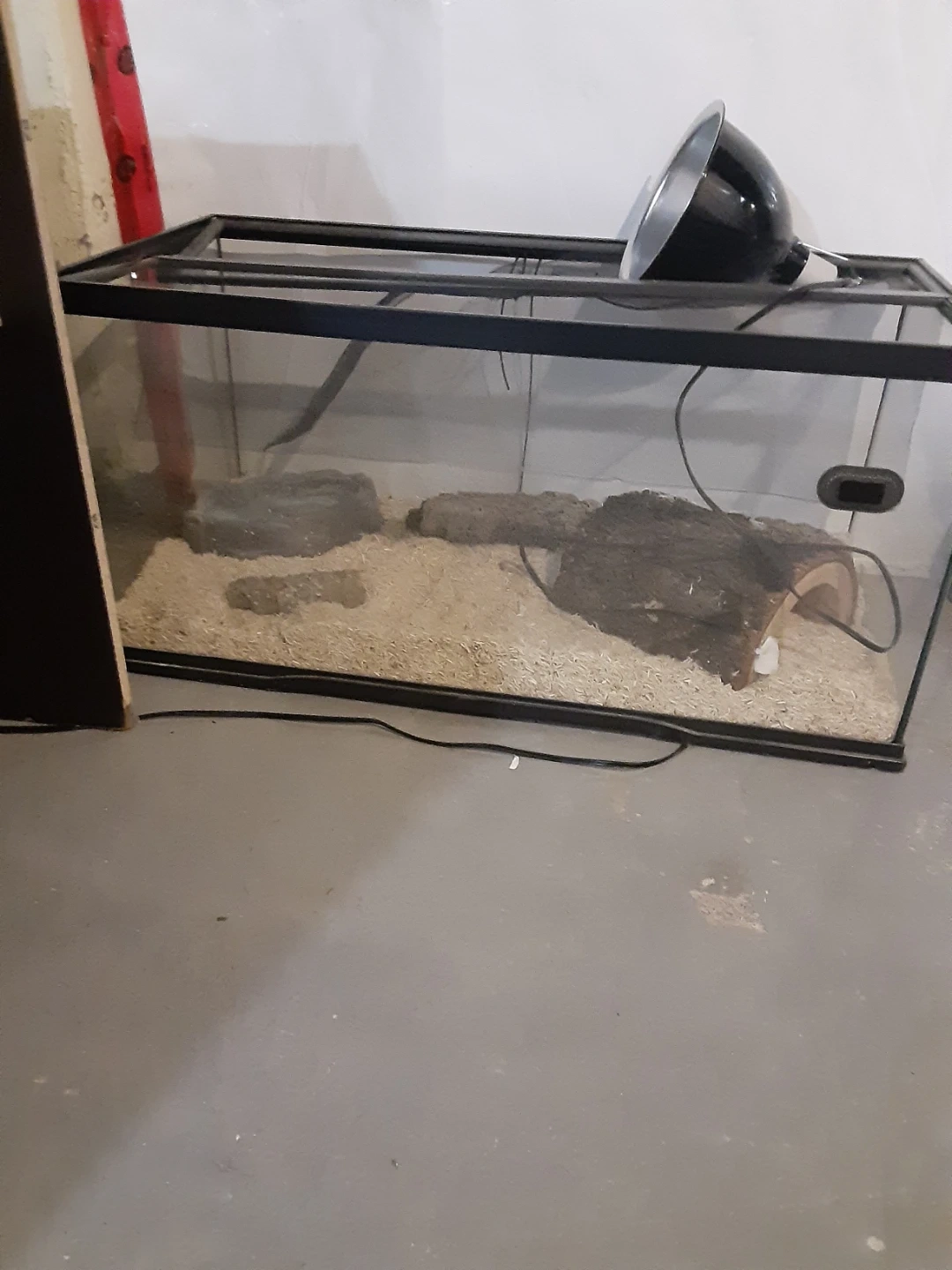 Selling a reptile terrarium that includes a heat lamp, a rock, and a log. It's all set up and ready for your reptile friend